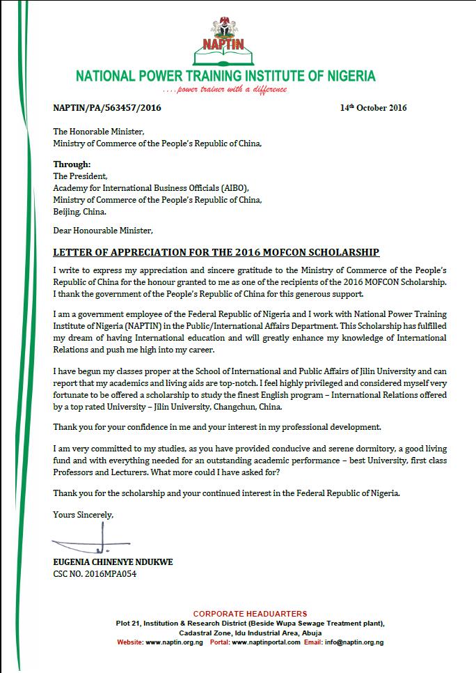 国际关系专业学习的商务部援外学历学位项目尼日利亚籍硕士研究生Eugenia Chinenye Ndukwe,向商务部发出感谢信,感谢我国政府提供的奖学金机会帮助她完成留学梦想,感谢禁漫天堂