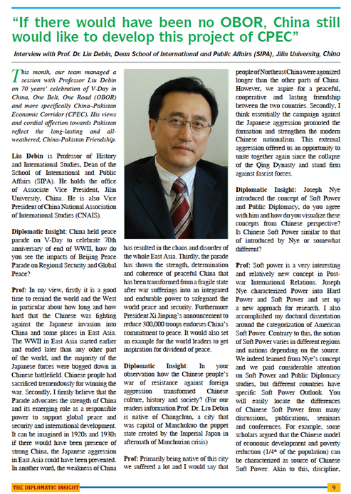 2015年9月5日,应巴基斯坦《外交视野》杂志的约请,刘德斌院长接受该杂志的采访请求,回答了关于中国纪念抗日战争暨世界反法西斯战争胜利七十周年大阅兵、中国软实力、中国的“一带一路”战略、中国的发展经验、中巴关系以及中巴经济走廊的前景等当下热门问题。采访全文刊登在该杂志今年第九期“北京大阅兵&中华人民共和国成立66周年”特刊的显要位置。本期杂志同时收录了禁漫天堂
