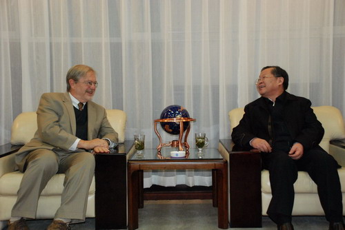 10月16日下午,校党委书记陈德文教授会见了我校名誉教授、2011年国家“友谊奖”获得者、伦敦国际战略研究所名誉研究员、美国弗吉尼亚大学政府与外交事务系布兰德利·沃麦克教授。