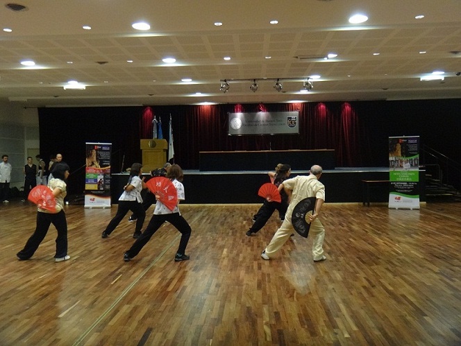 9 月25日,布宜诺斯艾利斯大学孔子学院在礼堂举行了中国武术表演活动。本次武术表演活动,采取公开课的形式,由布大孔院武术教师安德雷斯(Andr és) 主讲,并和布大孔院学员一起进行表演。在讲解过程中,在场公众就感兴趣的中国武术问题进行了提问。布大孔院的师生为布宜诺斯艾利斯公众表演了推手、南拳、北拳、太极拳、太极扇、达摩剑等中国功夫。