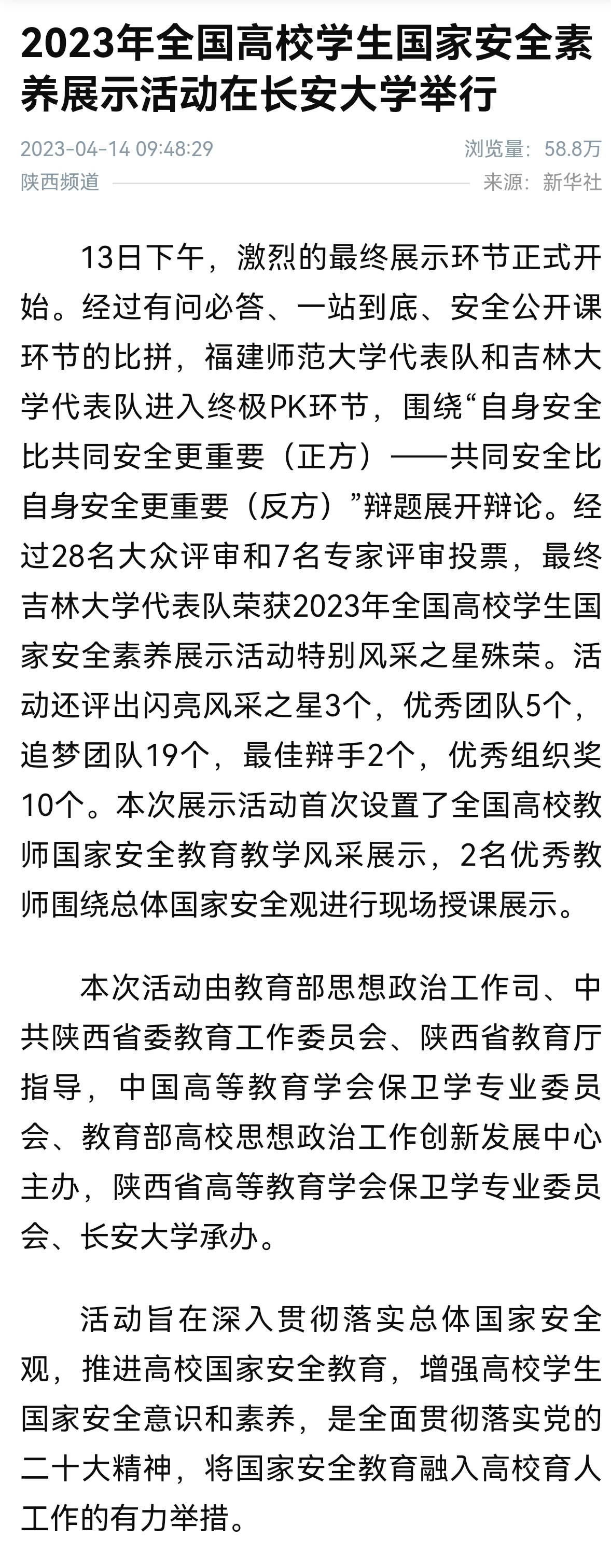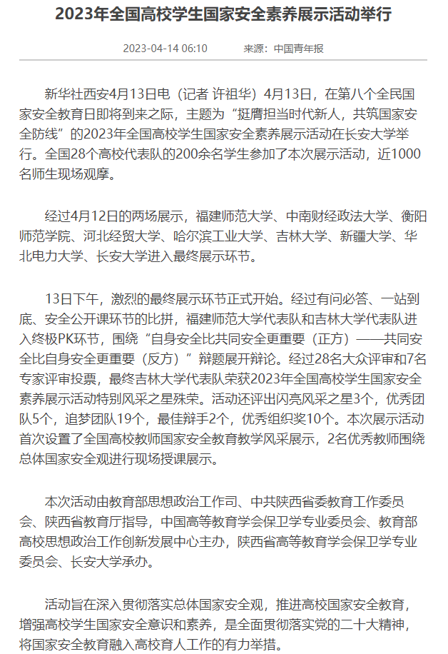据悉,高校学生国家安全素养展示活动由教育部思想政治工作司、中国高等教育学会保卫学专业委员会、教育部高校思想政治工作创新发展中心主办,以丰富的活动形式和高质量的活动内容增强了学生践行总体国家安全观的主动性,实现了以赛促学的目的,是全面贯彻落实党的二十大精神,将国家安全教育融入高校育人工作的有力举措。