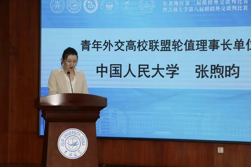 中国人民大学团委副书记张煦昀作为青年外交高校联盟本年度轮值理事长单位的代表,向张国兴副校长表示衷心的感谢,向参加本次比赛的各位选手、指导老师和工作人员表示亲切的问候,并强调了青年外交高校联盟在促进中国青年参与国际交往和国际传播、培养具有全球视野的青年人才方面所起的重要作用。张煦昀指出,本次比赛主题与联盟2024年工作要点高度契合,有助于帮助学生积累全球治理知识,提升外交实践技能,培养符合中国特色大国外交需求的国际化青年人才,从而推动青年外交事业的发展,并为联盟年度活动增添了亮点。她鼓励当代中国青年把握时代机遇,将个人理想与国家和民族的未来紧密结合,为国家发展和新时代中国外交事业贡献力量。