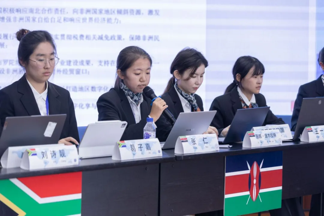 文学院2023级本科生王李同学作为参赛学生代表发言。她认为,模拟外交谈判不仅是一场竞技,更是一次学术与思想的碰撞,呼吁各位参赛选手在活动过程中不仅要推动“一带一路”倡议持续迸发活力,还要秉持世界眼光,协调各方利益,达成合作共识,展现出中非合作的潜力。