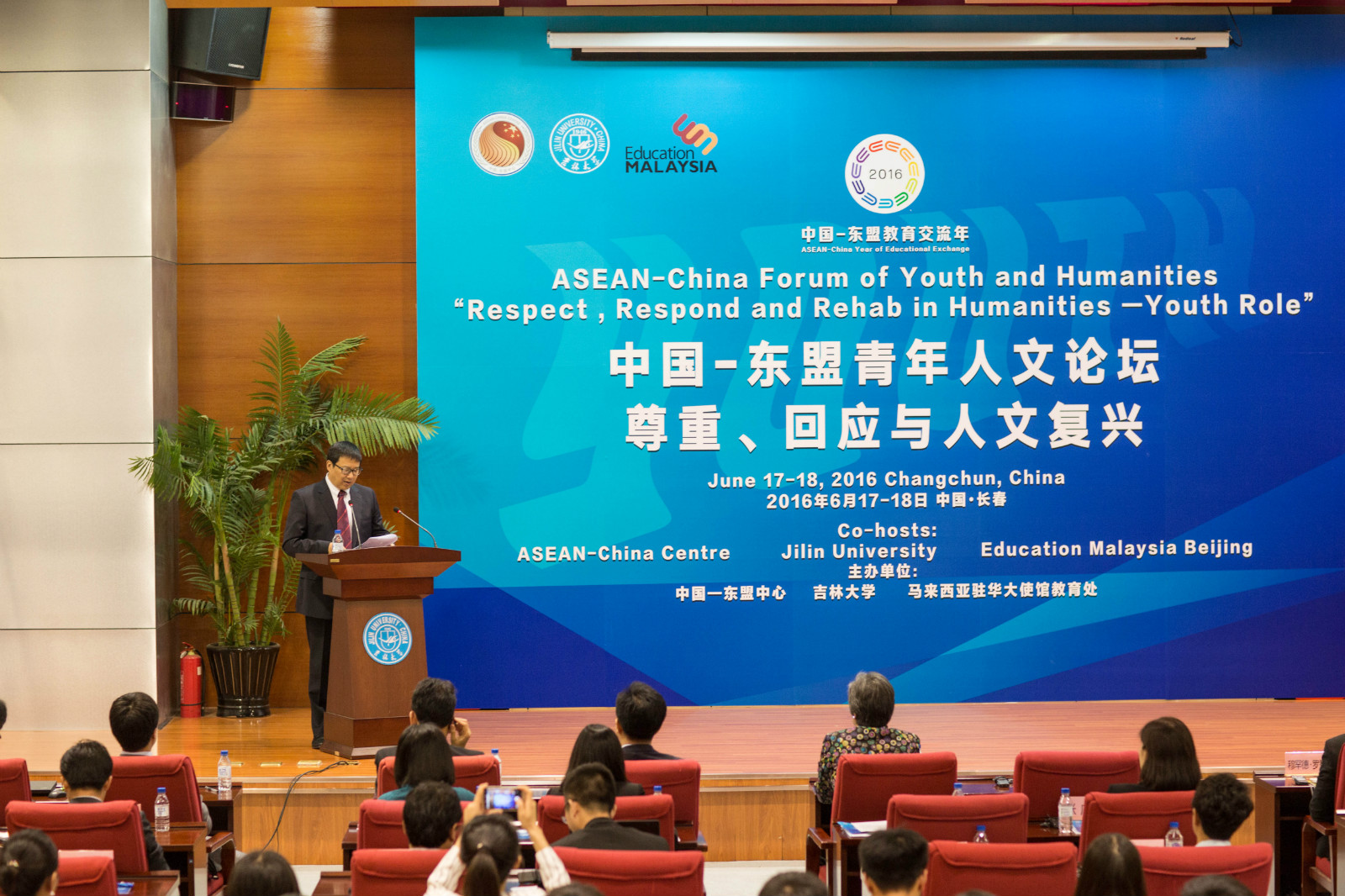 、马来西亚驻华大使馆教育处共同主办的“中国-东盟青年人文论坛”在我校举行,中国-东盟中心秘书长杨秀萍大使、东盟各国驻华使馆教育官员、长春各高校东盟留学生以及我校师生共170余人出席。此次论坛是2016年中国—东盟教育交流年系列活动之一,也是中国—东盟中心首次在东北地区举办的大型人文交流活动。