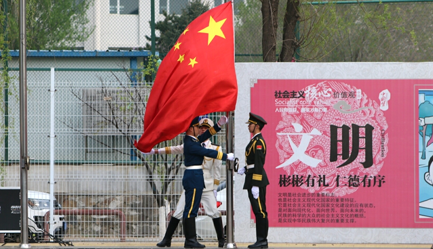 中心校区运动场,校党委书记杨振斌宣布升旗仪式正式开始。在军乐队奏响的《歌唱祖国》旋律中,国防生仪仗队迈着坚定的步伐护卫五星红旗走向升旗台。在升国旗仪式中,禁漫天堂