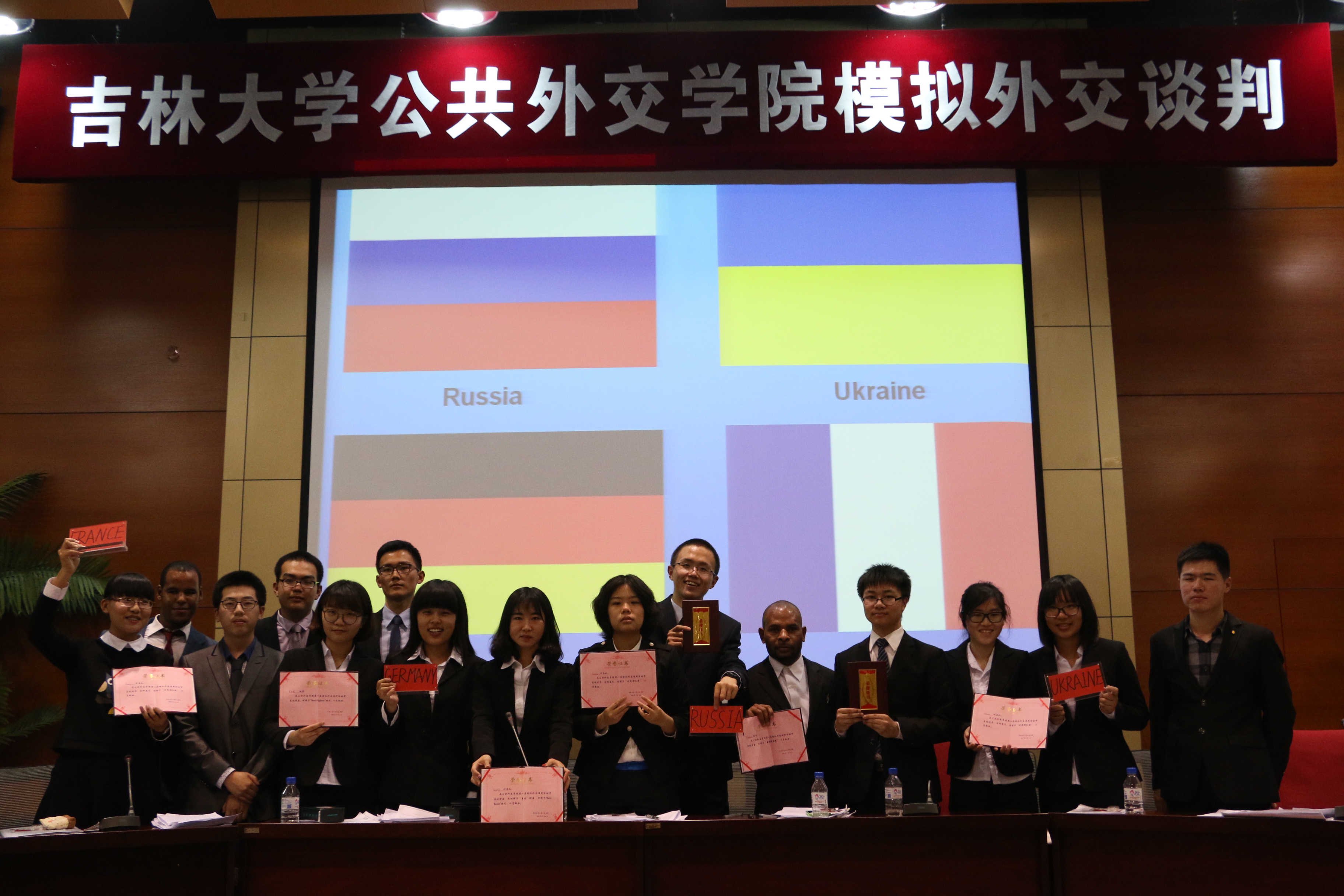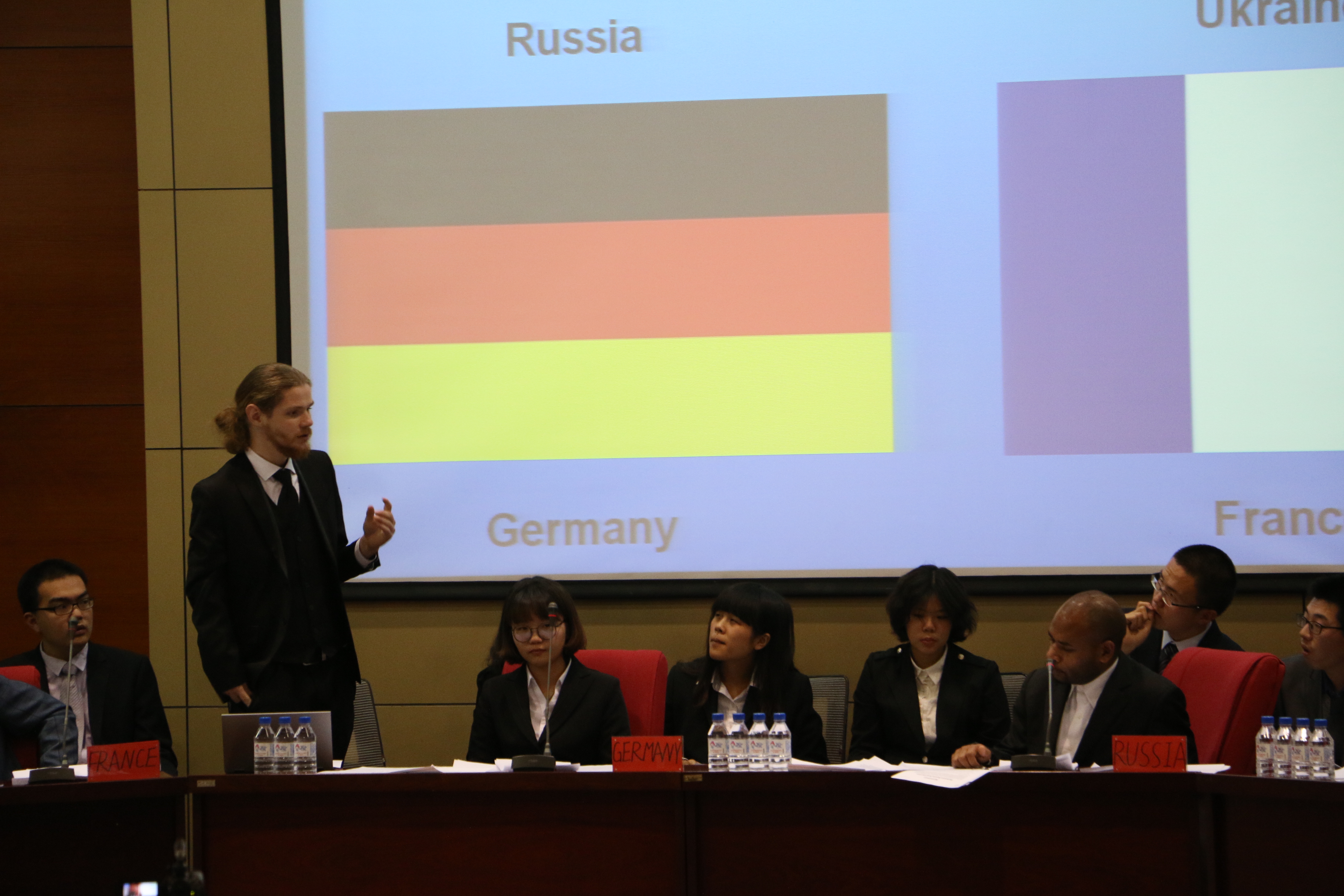 本科学、留学生以及来自其他学院的同学16名同学组成了法国、德国、俄罗斯和乌克兰四国外交代表团,就既定目 标进行斡旋、争论、磋商,最终达成协议共识。谈判流程分为五个部分,分别为文件公示、立场阐述、各国质询、公开演讲以及经自由谈判后达成最终协议。本次活 动全程用英文进行,同学们在争论质询和自由谈判中挥洒激情,大大提高了外交英语的实际运用能力。