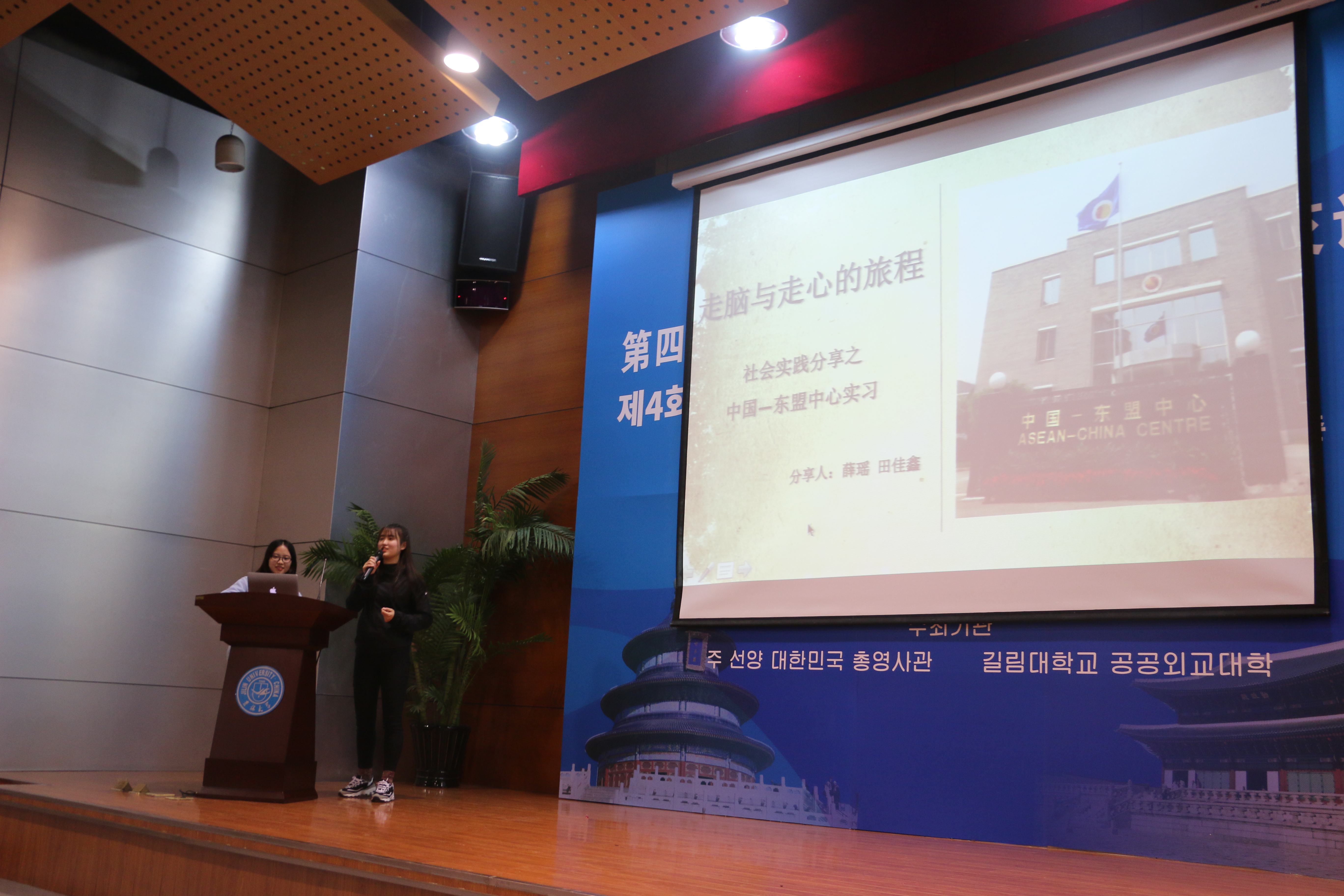 接下来是在暑期参与实习的中国--东盟中心的田佳鑫,薛瑶同学。田佳鑫同学主要向大家详细介绍了中心的由来,申请实习的步骤与东盟日常,为在座各位在假期的下一轮申请提供了便利。薛瑶同学则向大家讲述了她在中国—东盟中心初涉职场的一点心得体会。