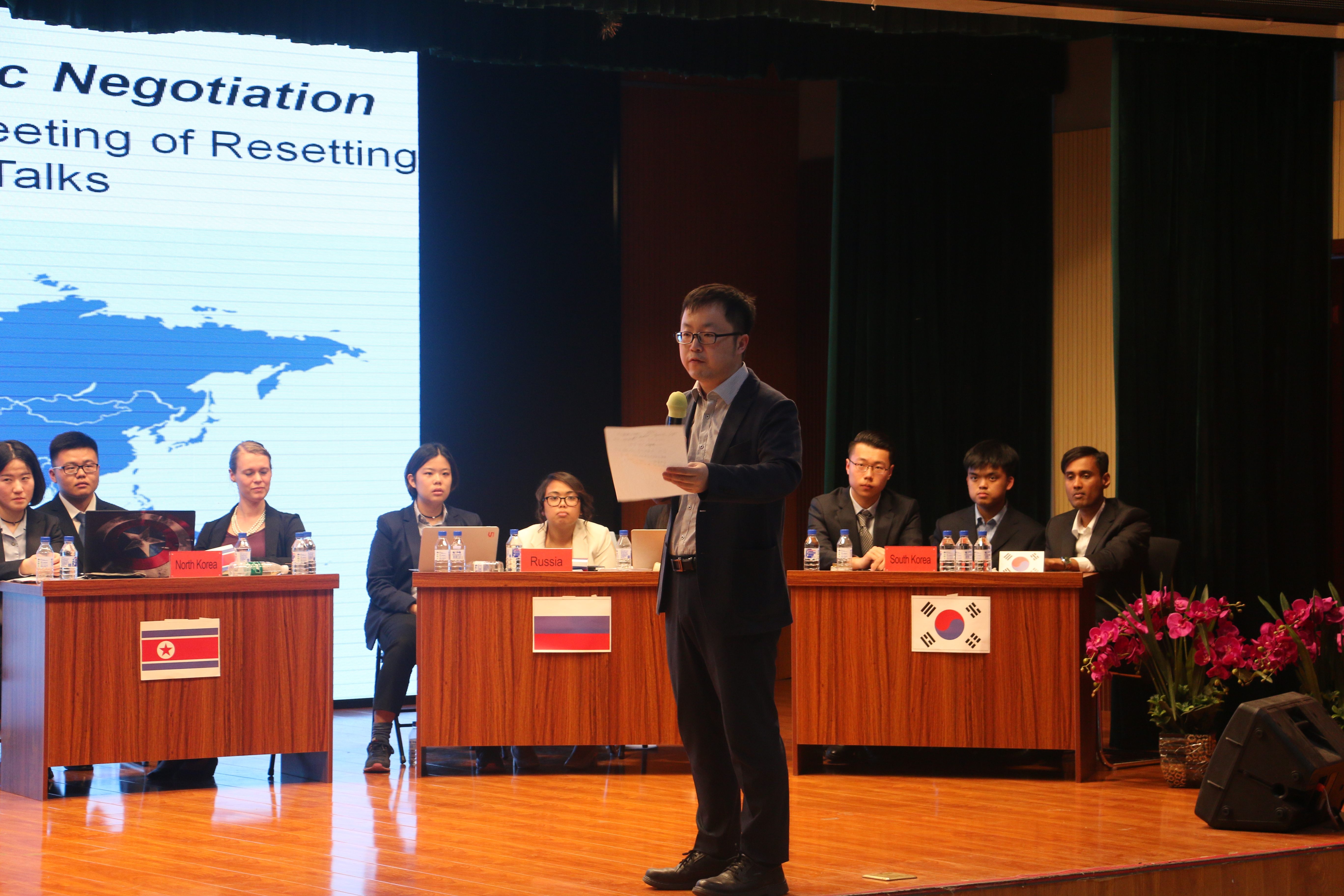 与会代表分别是由中国学生与加拿大访问学生共同组合的:美国代表、日本代表、俄罗斯代表、中国代表、韩国代表和朝鲜代表。本次谈判中,各位代表就自身利益出发点与相关关切发表了意见。其中,朝鲜、日本就“朝方释放人质同时日方减轻相应的经济制裁”达成一致;美国表示在停止核试验的基础上同意适当减少在亚洲地区的武装部署;韩国向朝鲜释放了愿意对话甚至合作的信号;中俄表示希望建立新的对话机制来和平解决半岛问题。