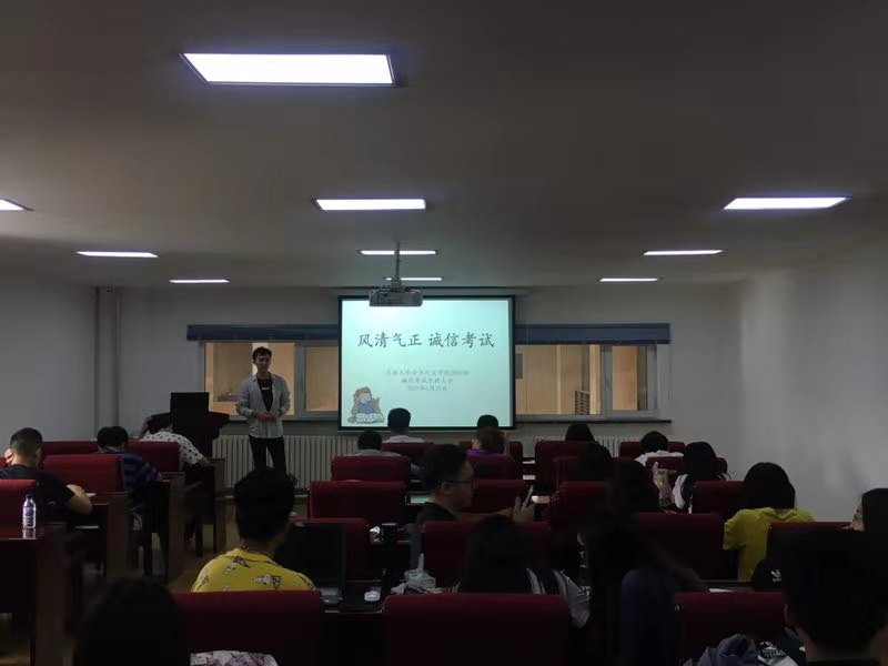 考试规则》,与会同学认真倾听。宣读完毕后,同学们共同签署考试诚信承诺书,以此约束自己严格遵守学校考试规范。考试期间,学院领导和辅导员分别到各年级考场进行巡考,严明考风考纪。