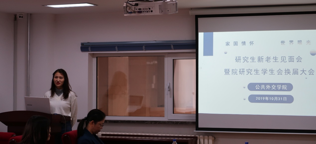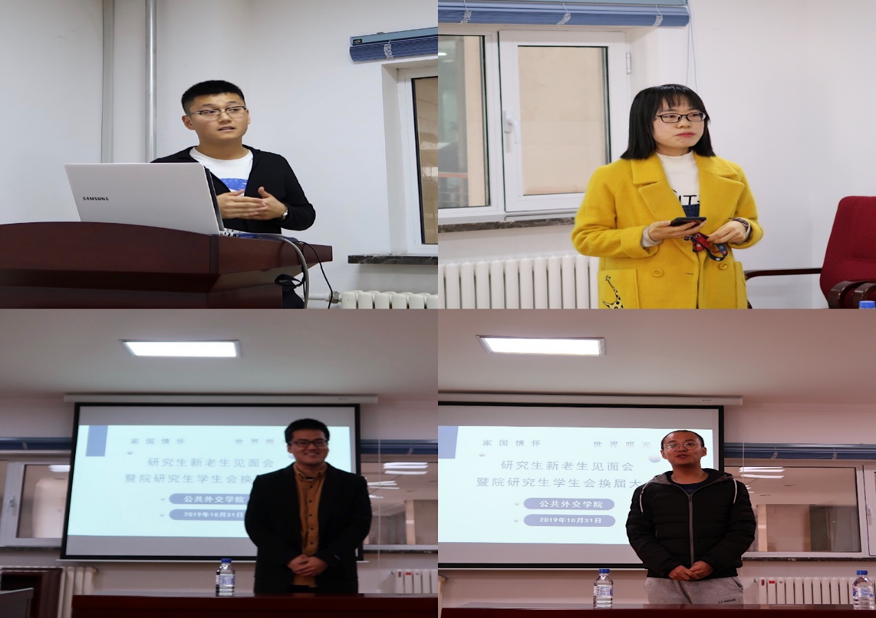 紧接着,第一届研究生会主席刘丹丹从研究生会举办的各大活动、经典专著的推荐、微信公众号的运营、日常宿舍管理等多方面对一年来的工作做了全面细致的总结。随后,研究生会的学生干部换届选举拉开了帷幕。各位候选人进行了选举演讲,他们从自我介绍到依据个人优势并结合所报岗位畅谈未来的工作规划和设想等多个方面进行了答辩,与会研究生根据候选人的竞选演讲进行了无记名投票,根据投票结果产生了新一届研究生会干部成员:孔祥琦当选研究生会主席、刘冠霖当选主席秘书、高桂芳当选学术部部长、王慧智当选文体部部长。新一批团结、拼搏、踏实的研会干部团队与现任研会干部团队进行了工作交接。
