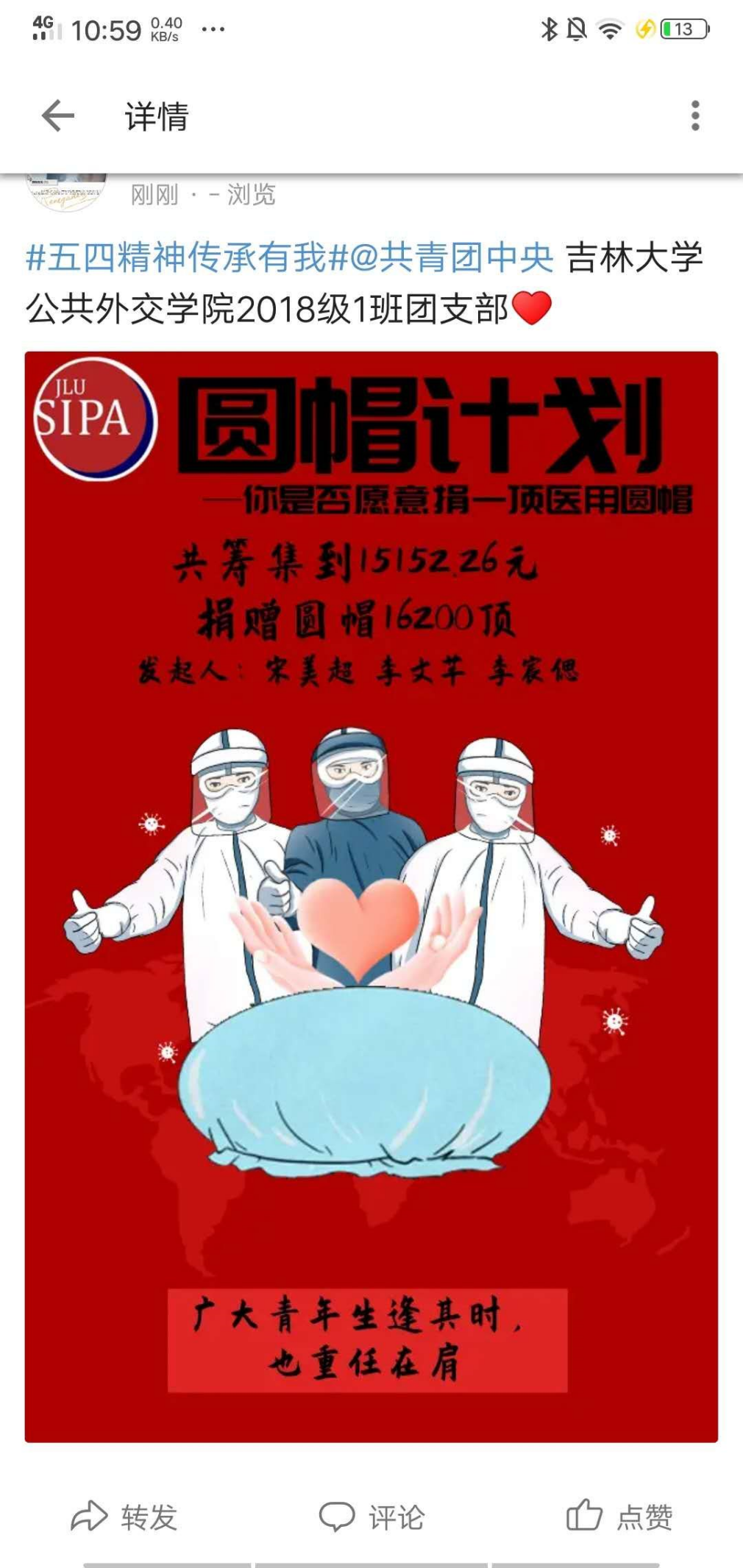 2020年初,众多一线医院与新型冠状病毒展开斗争,许多医护人员写下请战书,全国人民上下一心驰援武汉,各种募捐渠道都得到了广泛响应,真正让人体会到什么是“一方有难,八方支援”。然而,在紧张的抗疫之战中,湖北省一些医院物资不足,甚至出现五六位医护人员共用一套防护服的情况。在观察到这种状况之后,2018级1班团支部两位优秀青年宋美超和李文芊决定组织参与“医用圆帽捐赠计划”,自1月26日发起,结合当地疫情和医院需求,计划为湖北省黄冈市中心医院、孝感市第一人民医院、南漳县中医医院和咸宁市第一人民医院四家医院各捐赠5000个医用原帽。在社会各界的支持与努力下,此次计划最终为四家医院捐赠医用原帽共计16200顶。“圆帽计划”完美诠释了新时代青年生逢其时且重任在肩,在祖国最需要的时刻贡献青春力量的优良品质。我支部将此事件作为优秀的抗疫案例进行宣传,希望激励更多的青年踊跃投身于建设祖国的伟大工程之中,不畏艰险抗击疫情。