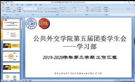 第五届团委学生会线上召开了2019—2020学年第二学期工作总结会议。本次会议由院团委学生会文体部部长信思涵主持,学生工作办公室主任王力老师、学院团委书记张淑艳老师、辅导员高梦鸽老师出席本次会议,第五届团委学生会2017级、2018级全体学生干部参加本次会议。