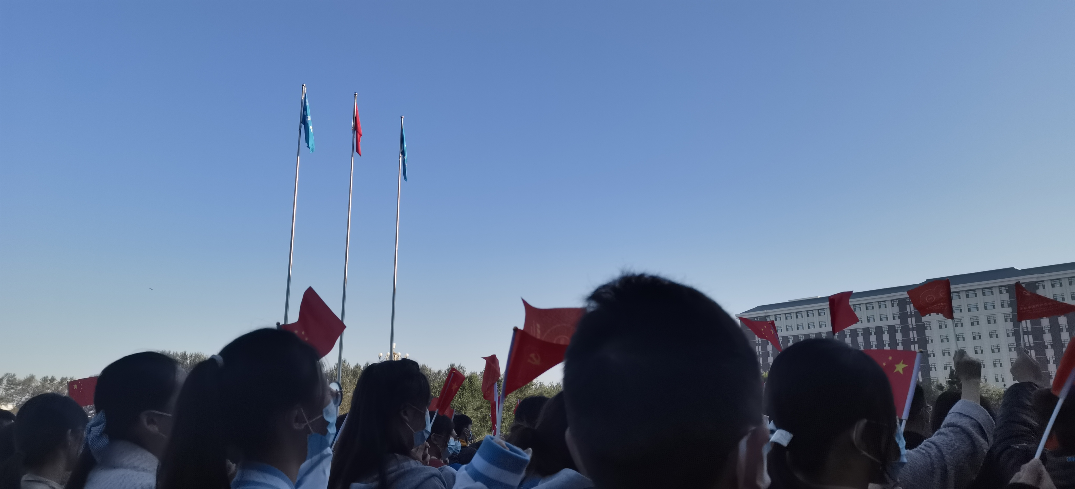 校旗在激昂的校歌声中缓缓上升,飘扬在蓝天之间。升旗礼毕,全体师生挥舞着手中的国旗并深情合唱《歌唱祖国》。