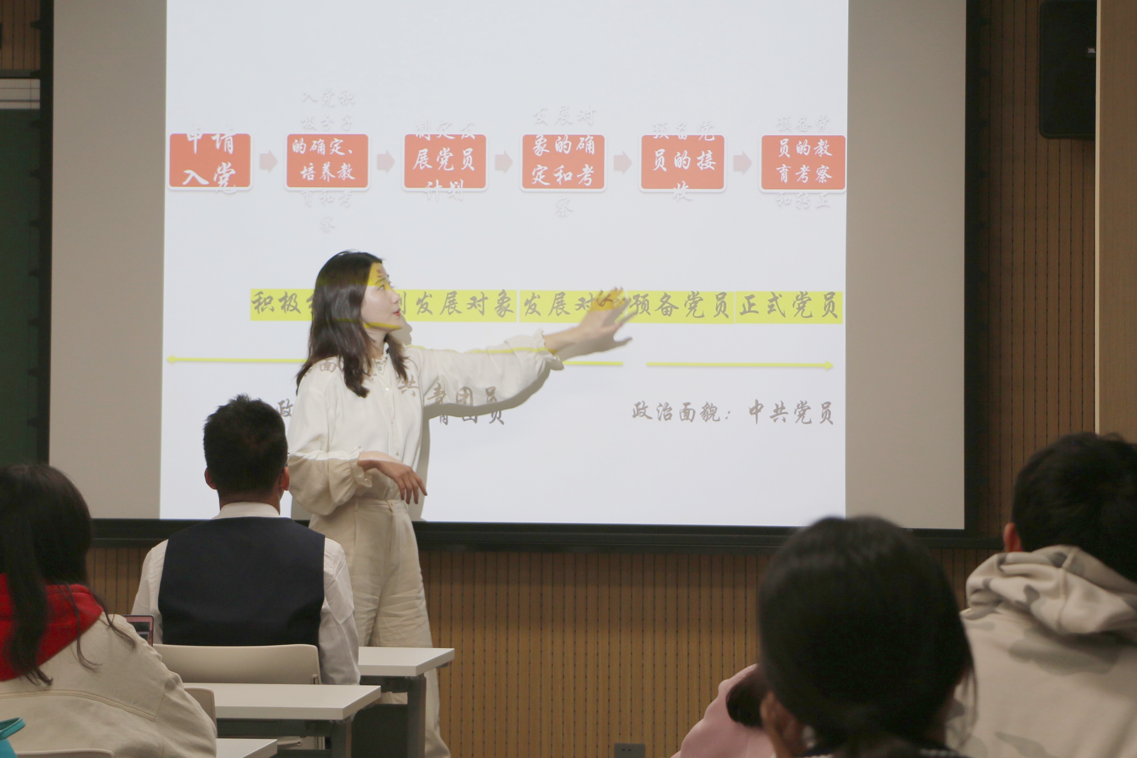 学生党支部的基本情况讲起,介绍了发展党员的工作流程,为大家规范了入党申请书、思想汇报的内容和格式要求,讲解了党徽、党旗的相关知识,并且耐心回答了同学们有关入党的问题,鼓励大家不忘初心,端正入党动机,积极向党组织靠拢。