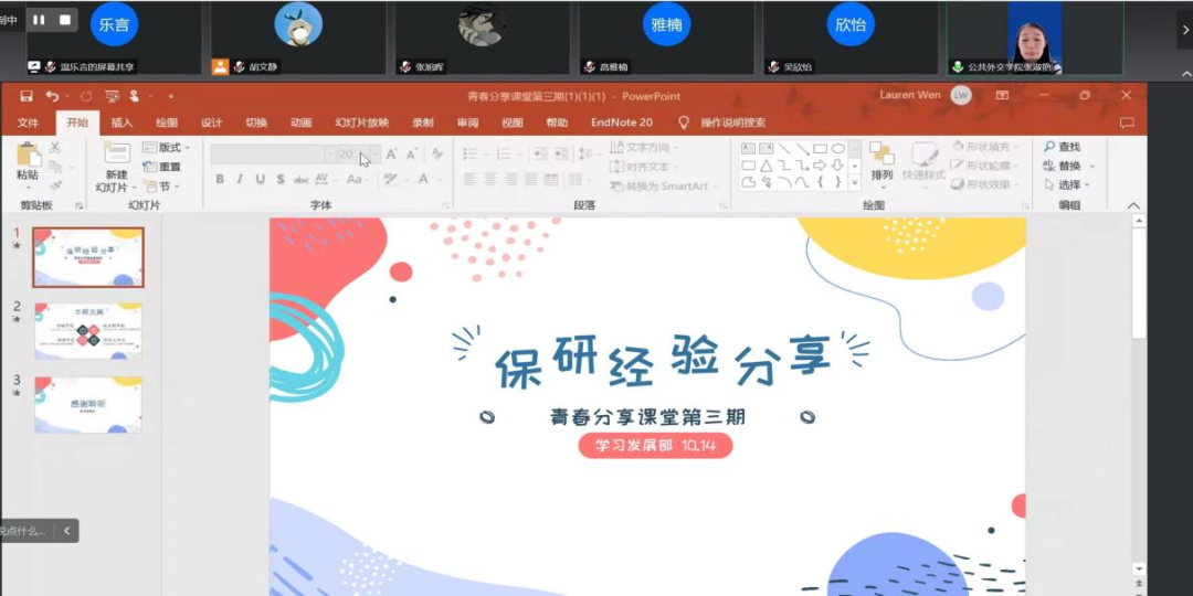 2019级本科生郑樾、余乐萌、柳潇、苏伊文为大家分享保研过程中的心得体会。本期分享会由2021级本科生温乐言同学主持,学院辅导员张淑艳老师和各年级SIPAer们参加。
