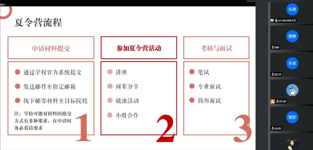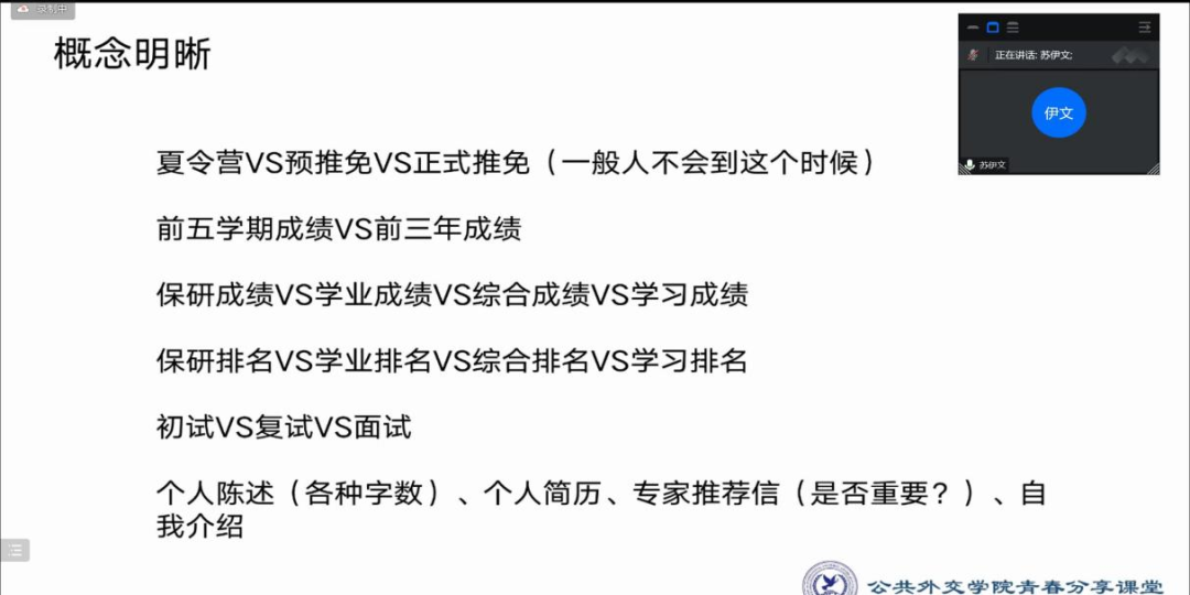最后,苏伊文同学对几位嘉宾的分享做了小结,他以幽默风趣的语言为大家明晰了夏令营、预推免以及正式推免等概念,又阐述了整体的保研时间线,提醒大家要做好规划,保持良好的学习习惯。同时,他以自身经验为例鼓励大家多多交流,在与同学们的交流反馈中取得进步。分享的最后,他强调了细节的重要性,建议大家“软硬实力都要兼顾”,不断提升专业能力才能打好未来推免竞争的基础。