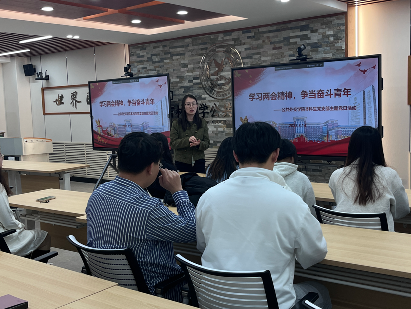 本科生党支部在吕振羽楼818室以“学习两会精神,争当奋斗青年”为主题开展了3月份党日活动。活动由支部书记张淑艳主持,在校支部党员参加。