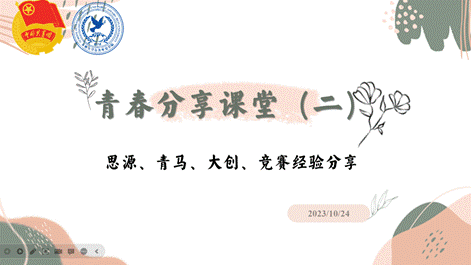 举办本学期第二期“青春分享课堂”活动。活动由2023级本科生卢君彭主持,邀请2020级本科生田园、韩一赫,2022级本科生周炜佳、梁嘉栩分别进行“大创”、竞赛科研、青马工程及思源计划的相关分享。
