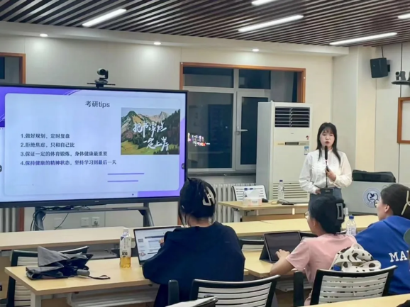 第二位分享者王玉蓉同学就考研选择与规划、复习策略以及常见陷阱进行了分享。她首先强调考研选择和规划的重要性,建议同学们根据自己的实际情况,选择最适合自己的院校,以自己的节奏进行备考。在专业课复习方面,她分享了自己的复习技巧,列举了在考研过程的常见问题并逐一进行解答,帮助同学们明确方向。最后,她鼓励同学们在过程中保持平和的心态,祝福大家能够取得满意的成绩。