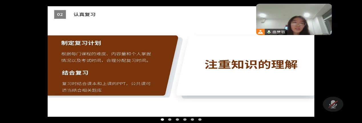 分享会上,曲同学从备考态度、备考行动以及备考策略等方面与同学们进行了分享。曲同学特别提醒了备考态度和制定复习计划的重要性,让面临大学首次期末考试的新生们对于期末考试有了一定的了解,同时增强了对期末考试的信心。分享会最后,曲同学还特意提醒同学们要诚信考试,杜绝任何形式的作弊,预祝大家期末取得好成绩。