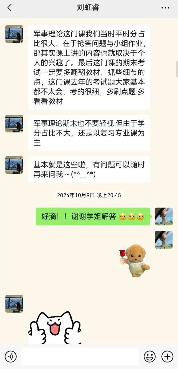 “青蓝相济,共赴学海路”。初入大学,学妹难免有许多迷茫与困惑。身为学姐,能为她答疑解惑,帮助她找到合适的课程学习方法,是一件极有意义之事。这段时光里,我见证了她的成长蜕变,自己也收获了满足,愿她在大学乘风破浪,未来皆坦途。