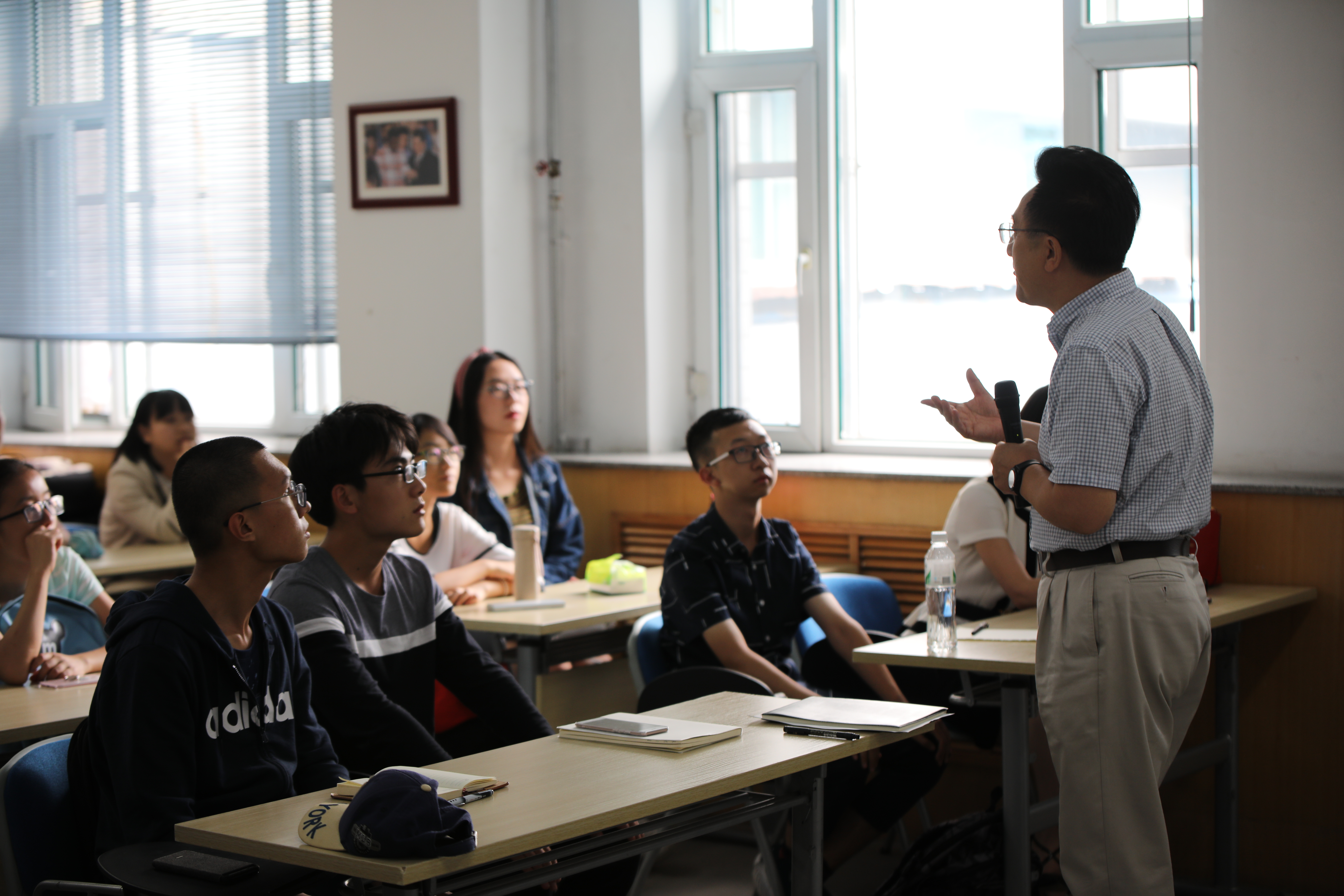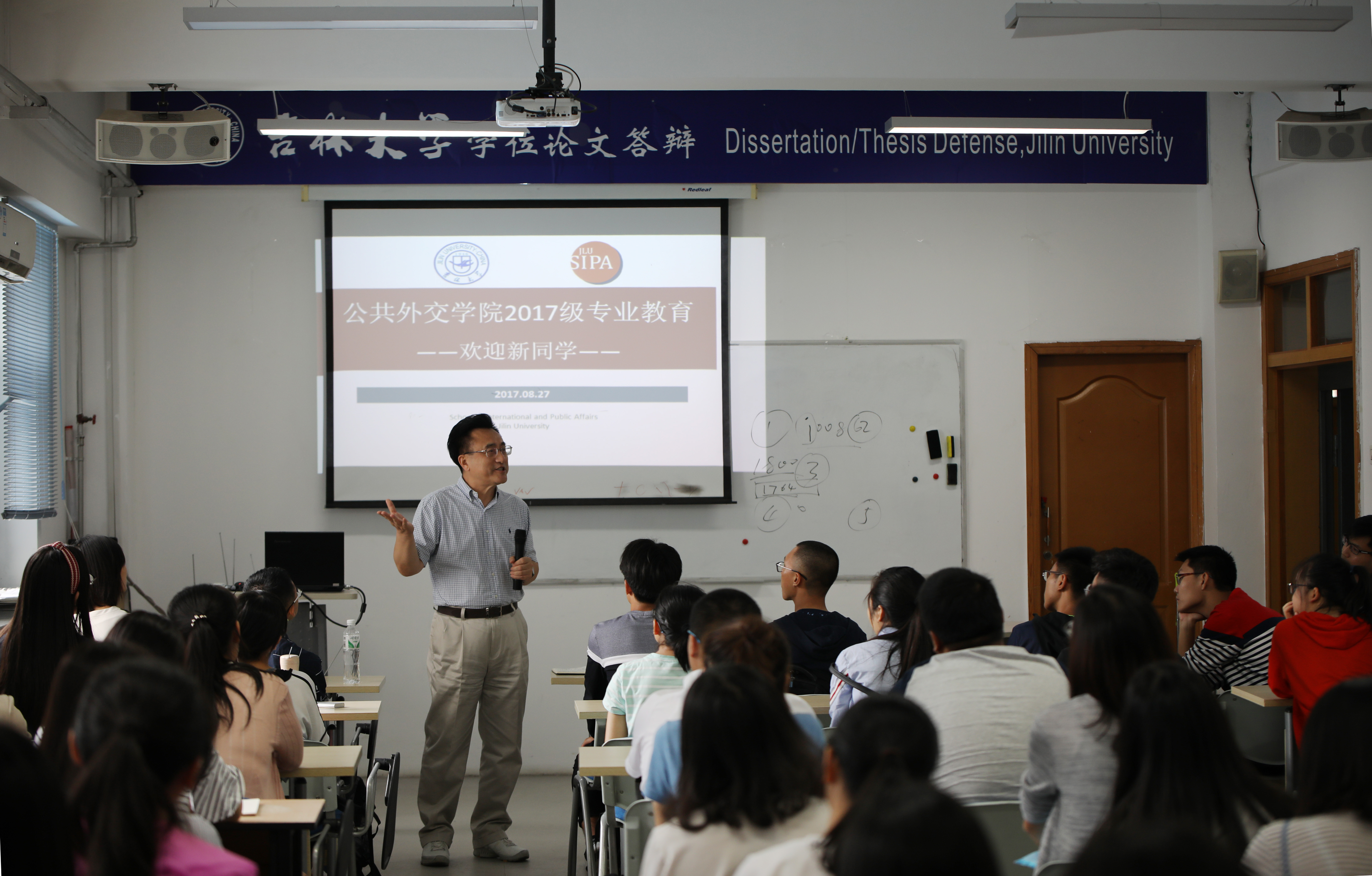 学习,并就学院设立的时代背景、学院目前各方面的情况以及学院未来的发展规划做了详细的解读。随后,刘德斌老师从自身的学术经历出发,在谈话中与大家分享了在英美留学的经验、参加中外各类学术研讨会的广博见闻以及在多年治学过程中总结出来的深刻体会,着重强调了新生需要有心系天下的胸怀以及作为中华民族一份子,特别是作为一名外交学专业的同学更应该具有的民族责任感。