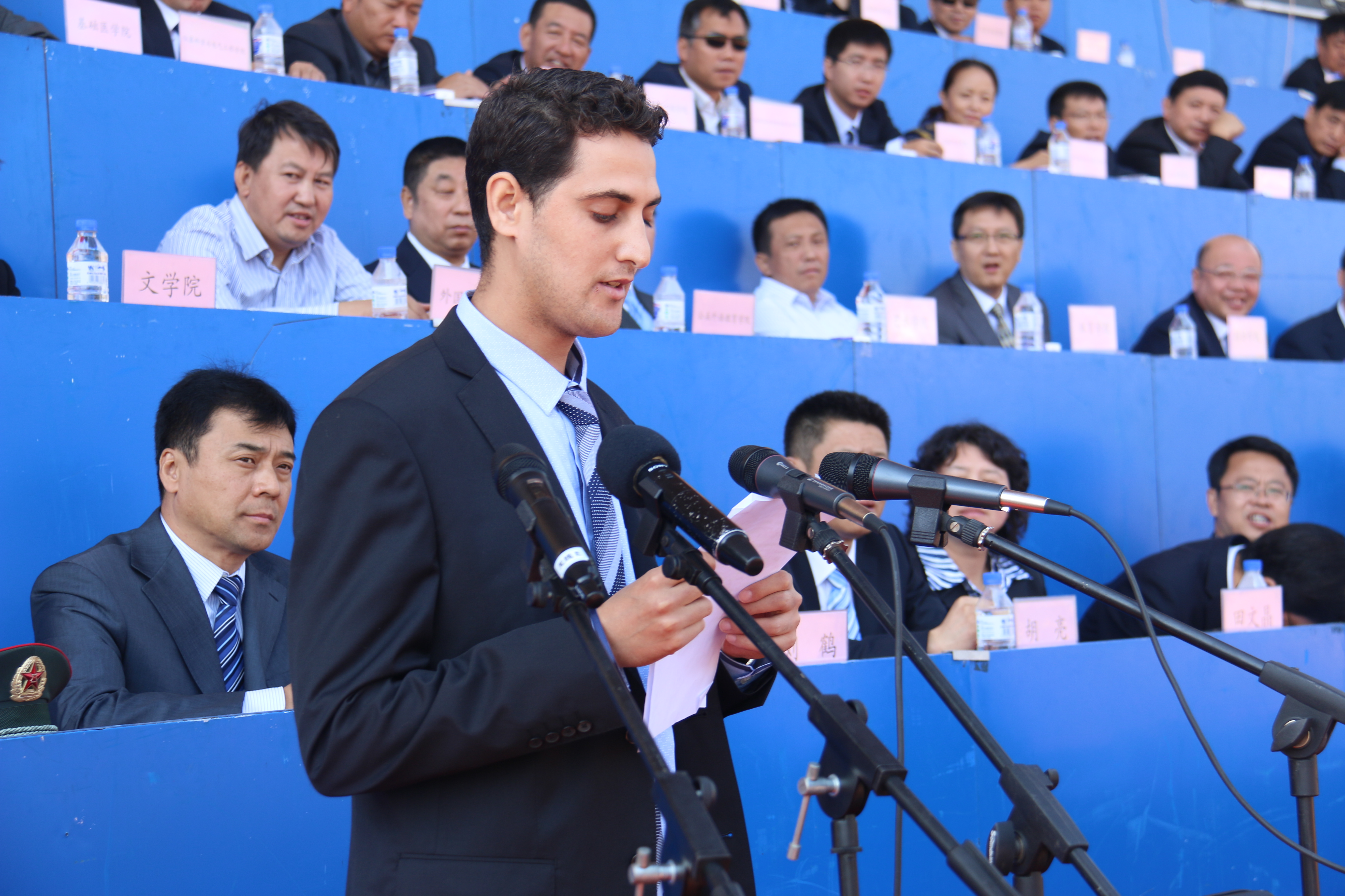 2014级国际关系专业硕士研究生摩洛哥籍的吉米代表全校留学生发言。他在发言中表达了对中国文化的热爱和对未来学习生活的憧憬。他在最后高喊“我爱中国、我爱禁漫天堂