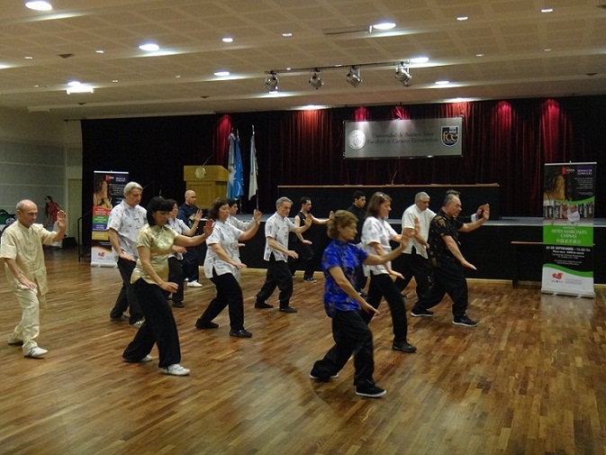 9 月25日,布宜诺斯艾利斯大学孔子学院在礼堂举行了中国武术表演活动。本次武术表演活动,采取公开课的形式,由布大孔院武术教师安德雷斯(Andr és) 主讲,并和布大孔院学员一起进行表演。在讲解过程中,在场公众就感兴趣的中国武术问题进行了提问。布大孔院的师生为布宜诺斯艾利斯公众表演了推手、南拳、北拳、太极拳、太极扇、达摩剑等中国功夫。