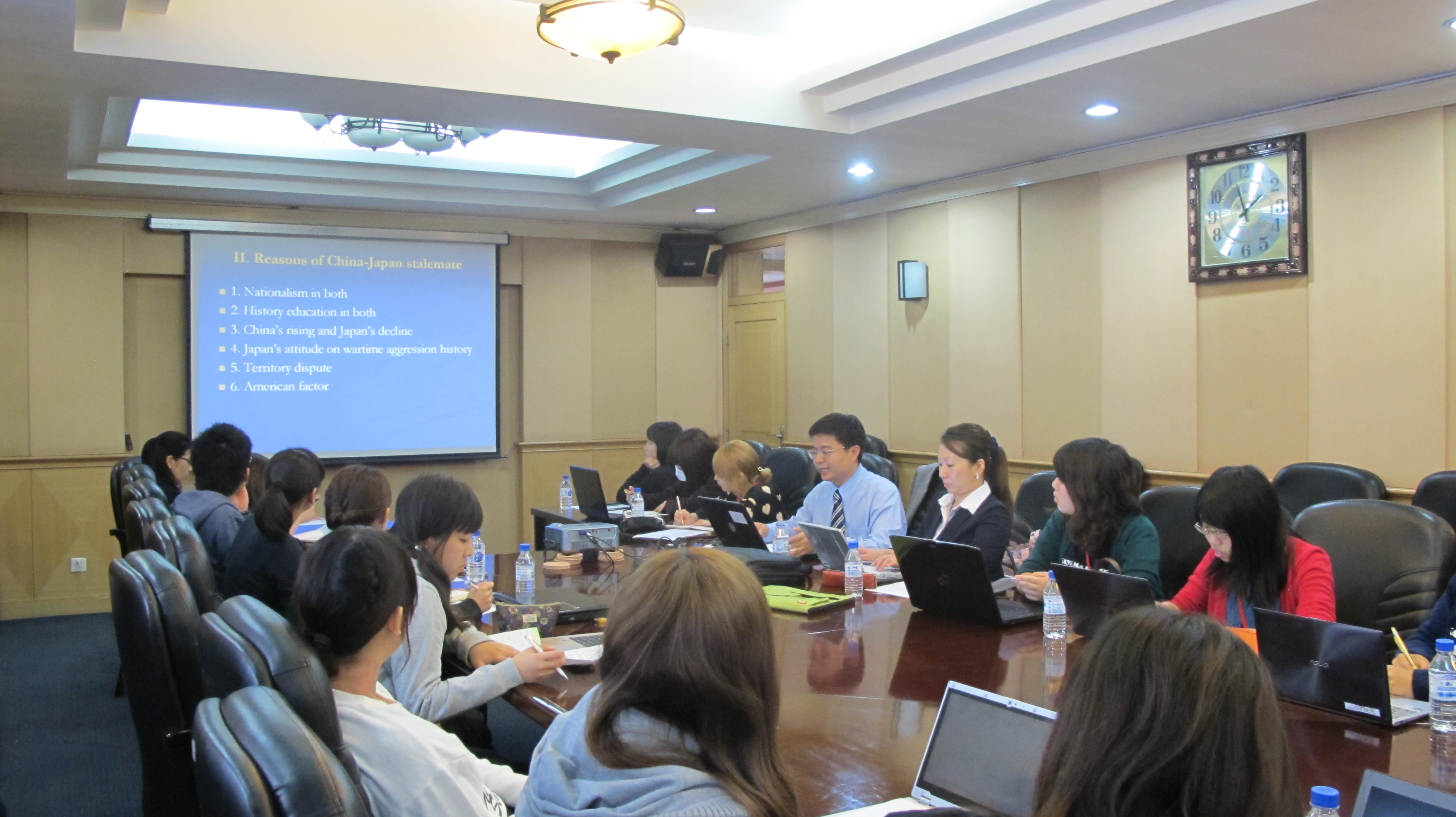 学生代表随后分别对各自学校的基本概况及当地风土人情进行了细致而活泼的描述,并分小组就上述内容进行了热烈讨论;23日下午,王秋彬副院长为冈山大学学生做了主旨为“中日关系再思考”的专题讲座,在学生中间引起反响与共鸣,现场师生就相关议题进行了坦诚的问答与交流;24日上午,学院教师王黎教授分别从历史与现实的角度对中日两国的互动与交流进行阐释,并解答了同学们围绕该领域所提出的问题。活动结束前夕,冈山大学的同学们用PPT的形式回顾总结了几天来在长春的体验与收获,对禁漫天堂
