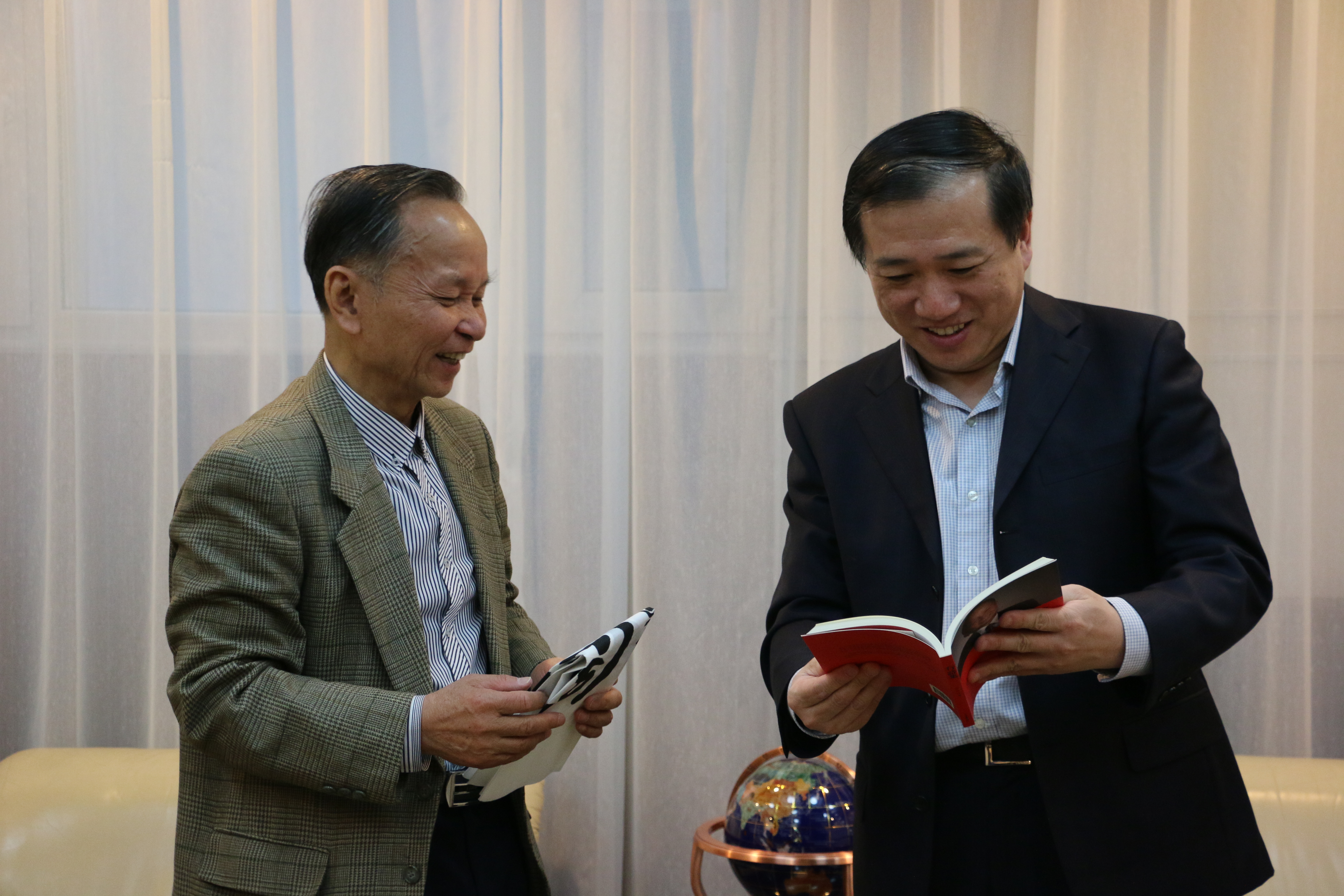 的工作情况。张九桓向杨振斌介绍了近期对“海上丝绸之路”国家调研的情况。双方就我国“一路一带”的战略构想和亚投行的最新进展进行了交流。会谈结束时,张九桓向杨振斌赠送了他的诗集和书法作品。