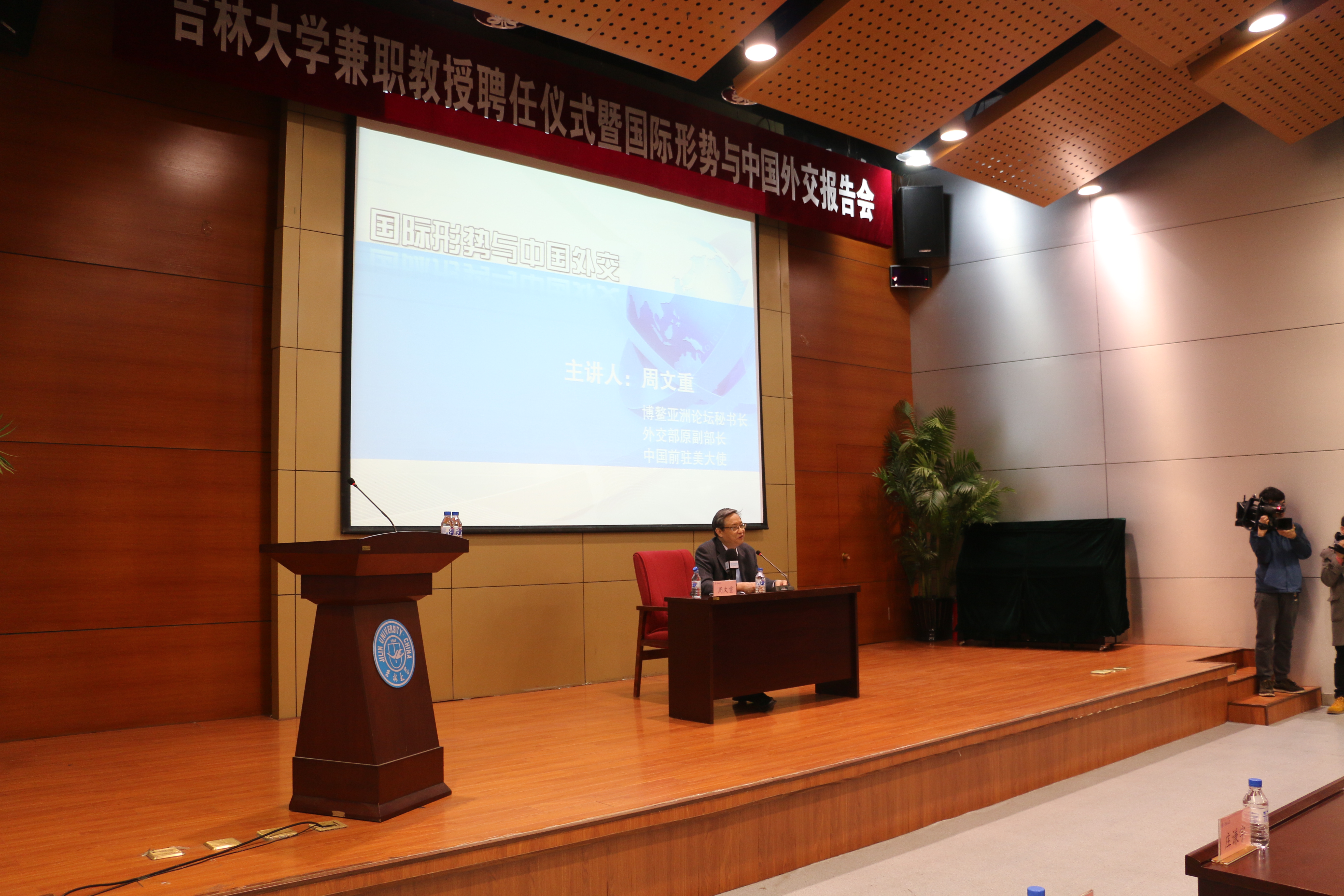 兼职教授聘任仪式暨国际形势与中国外交报告会在中心校区国际学术讲堂举行。外交部原副部长、博鳌亚洲论坛秘书长周文重受聘吉大禁漫天堂