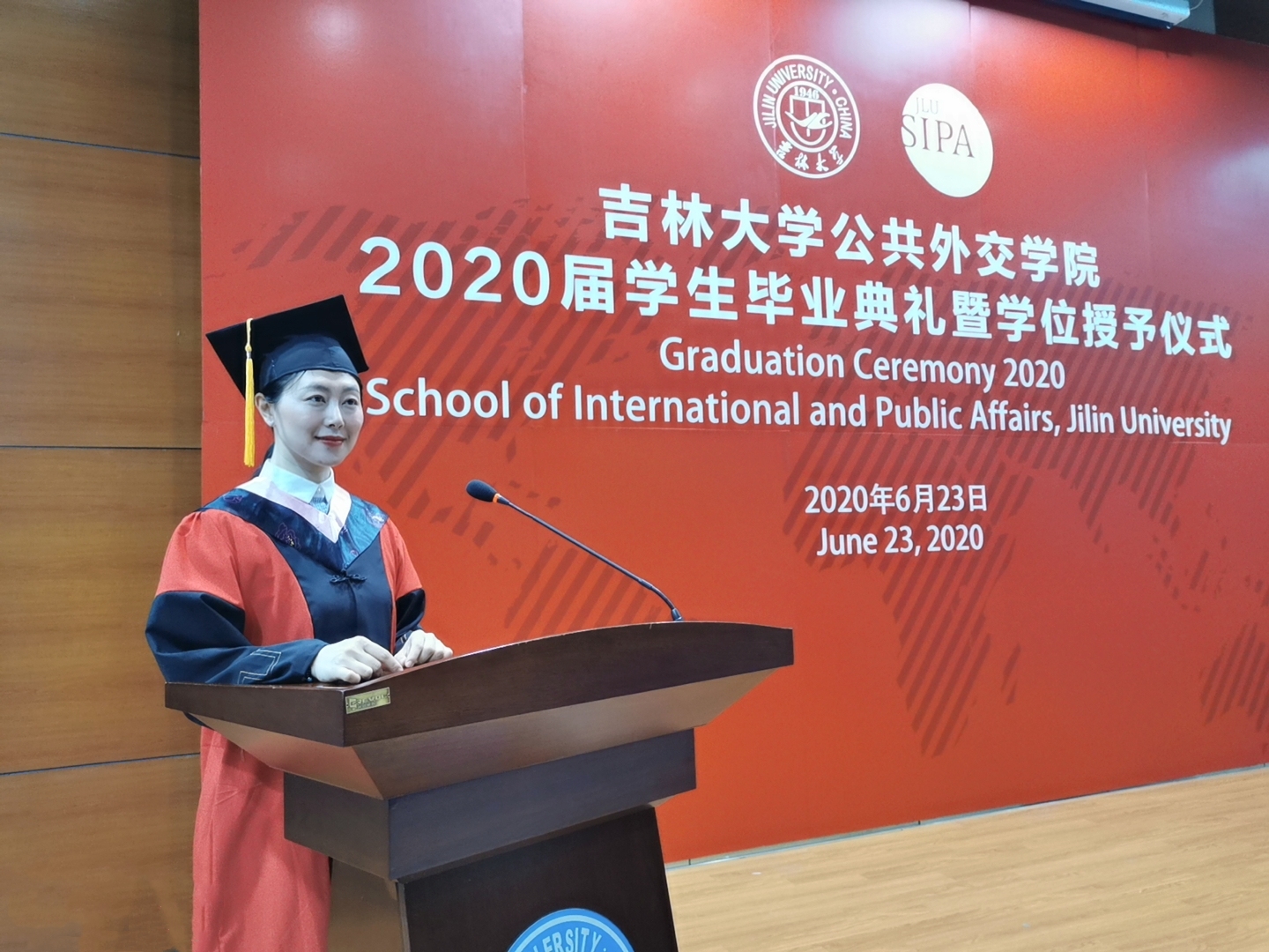 毕业典礼在雄壮的国歌声中拉开帷幕,院长肖晞教授以《风雨同舟 阳光依旧》为题致辞,为全体毕业生送上诚挚的祝福和殷切的希望。她首先强调在全国抗击新冠疫情的特殊时期,组织同学们返回校园开展毕业活动体现了学校对毕业生的全方位关怀和厚重的情意。作为外交学专业的学生,应该更加深刻地认识到国家在抗击疫情的过程中最大程度保障人民生命安全的决心,看到中国特色社会主义制度的优越性、中华民族的伟大精神以及在国际社会中得到的广泛赞誉和认可,将“世界眼光,家国情怀”的院训内化于心、外化于行,并提议向全国奋战在抗疫第一线的医护人员、各行各业的从业人员和志愿者以及严格遵守居家隔离的每一位平凡而伟大的参与者鼓掌致敬。