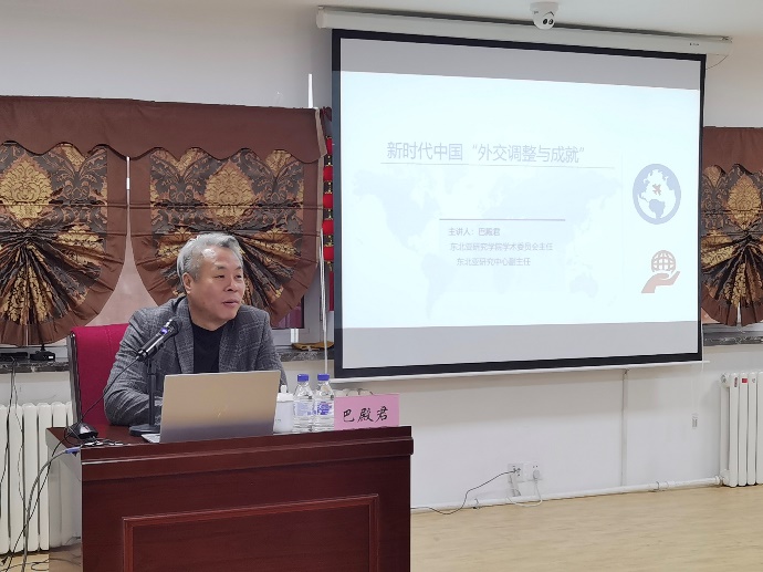 于吕振羽楼214会议室召开学习贯彻十九届六中全会精神宣讲会暨党风廉政建设警示教育大会。宣讲会邀请学校学习贯彻十九届六中全会精神宣讲团成员东北亚研究院学术委员会主任、东北亚研究中心副主任巴殿君为全体教职工进行宣讲,学院领导班子成员、“两委”委员、各党支部书记、教职工和学生代表参加了活动,会议由学院党委书记杨民主持。