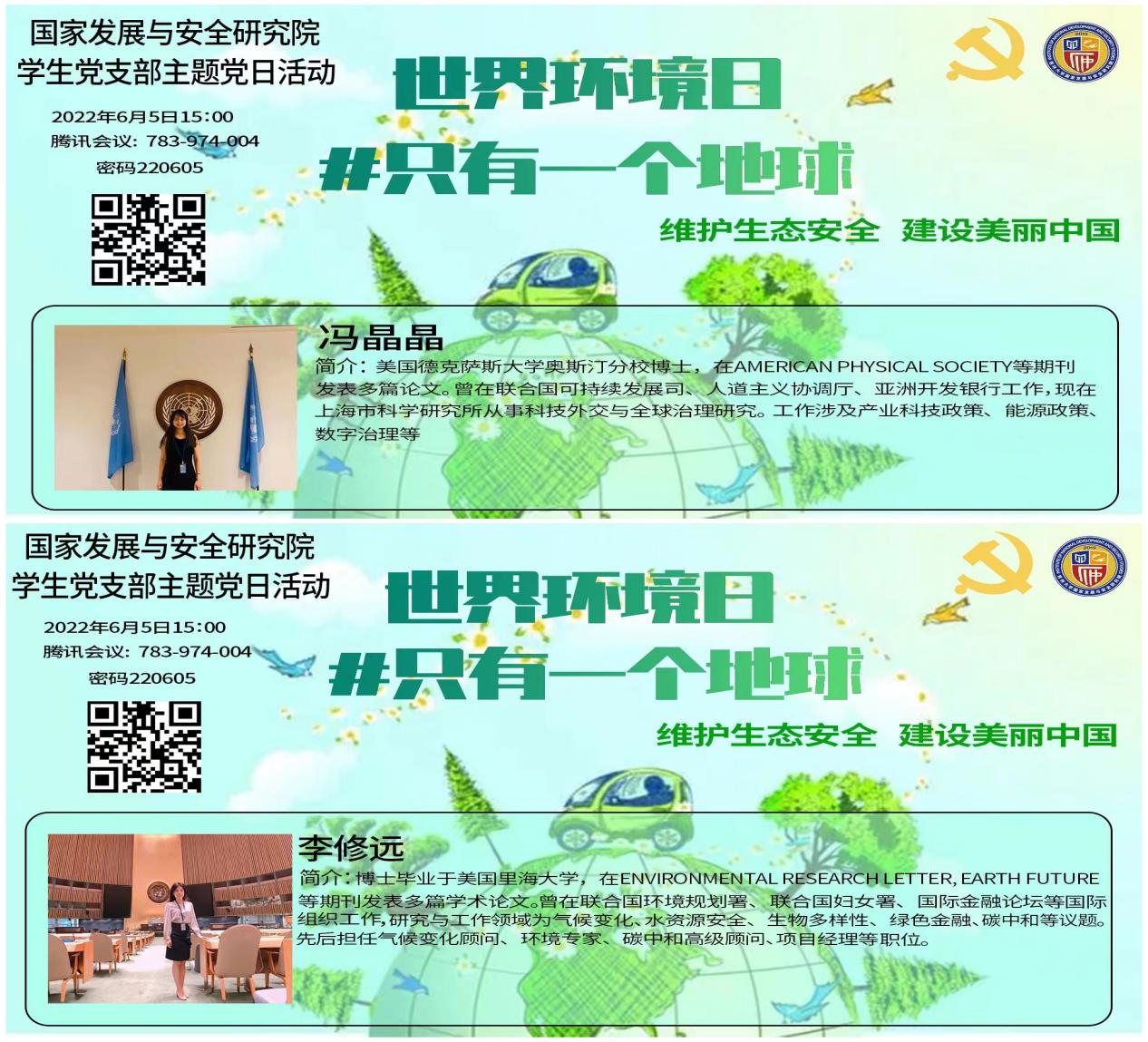 6月5日,国家发展与安全研究院学生党支部以“维护生态安全,建设美丽中国”为题召开线上主题党日活动。此次活动特别邀请原国际金融论坛环境专家、联合国环境规划署、妇女署顾问李修远博士和上海市科学学研究所研究员、原联合国可持续发展司职员冯晶晶博士后参会分享,禁漫天堂