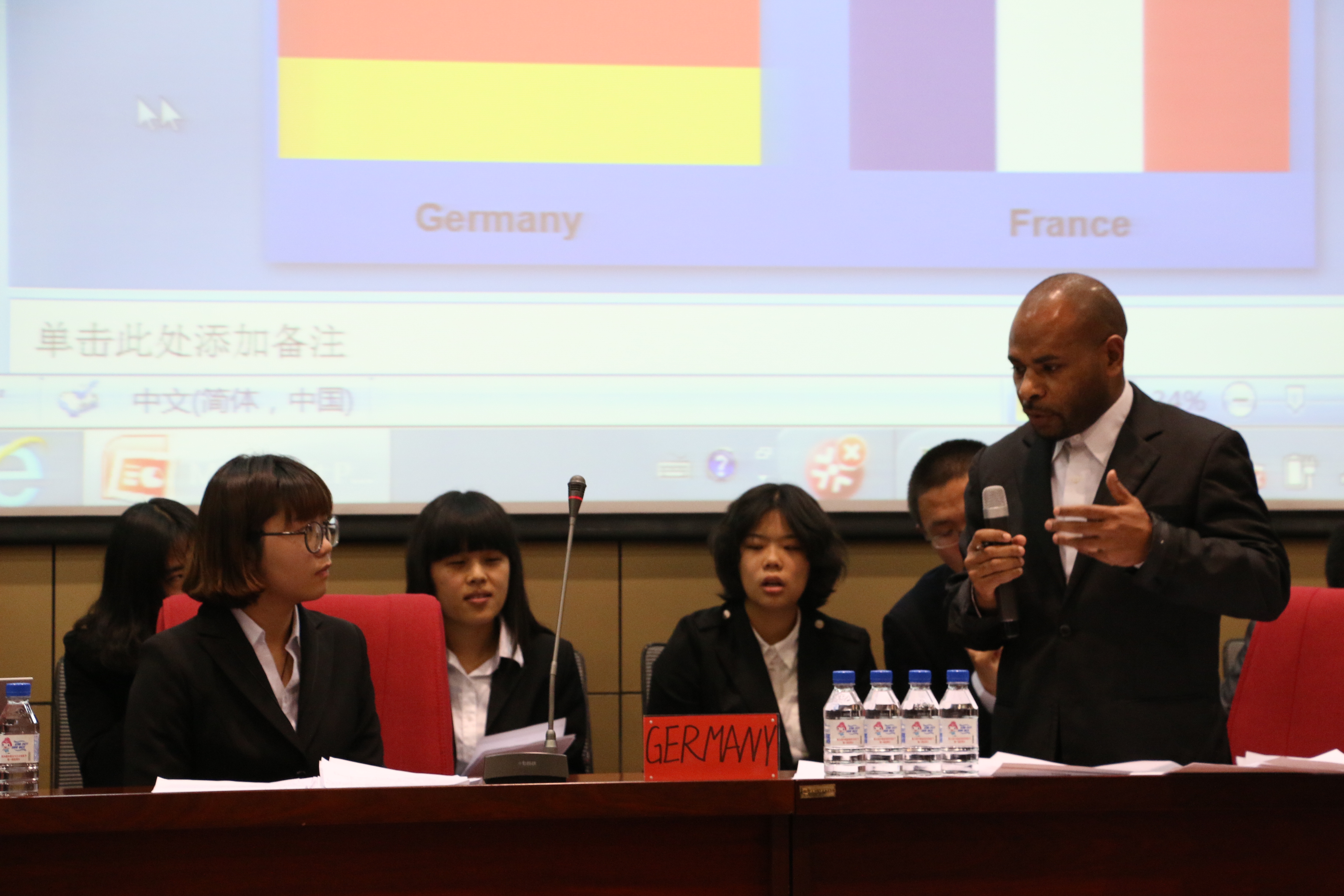 本科学、留学生以及来自其他学院的同学16名同学组成了法国、德国、俄罗斯和乌克兰四国外交代表团,就既定目 标进行斡旋、争论、磋商,最终达成协议共识。谈判流程分为五个部分,分别为文件公示、立场阐述、各国质询、公开演讲以及经自由谈判后达成最终协议。本次活 动全程用英文进行,同学们在争论质询和自由谈判中挥洒激情,大大提高了外交英语的实际运用能力。