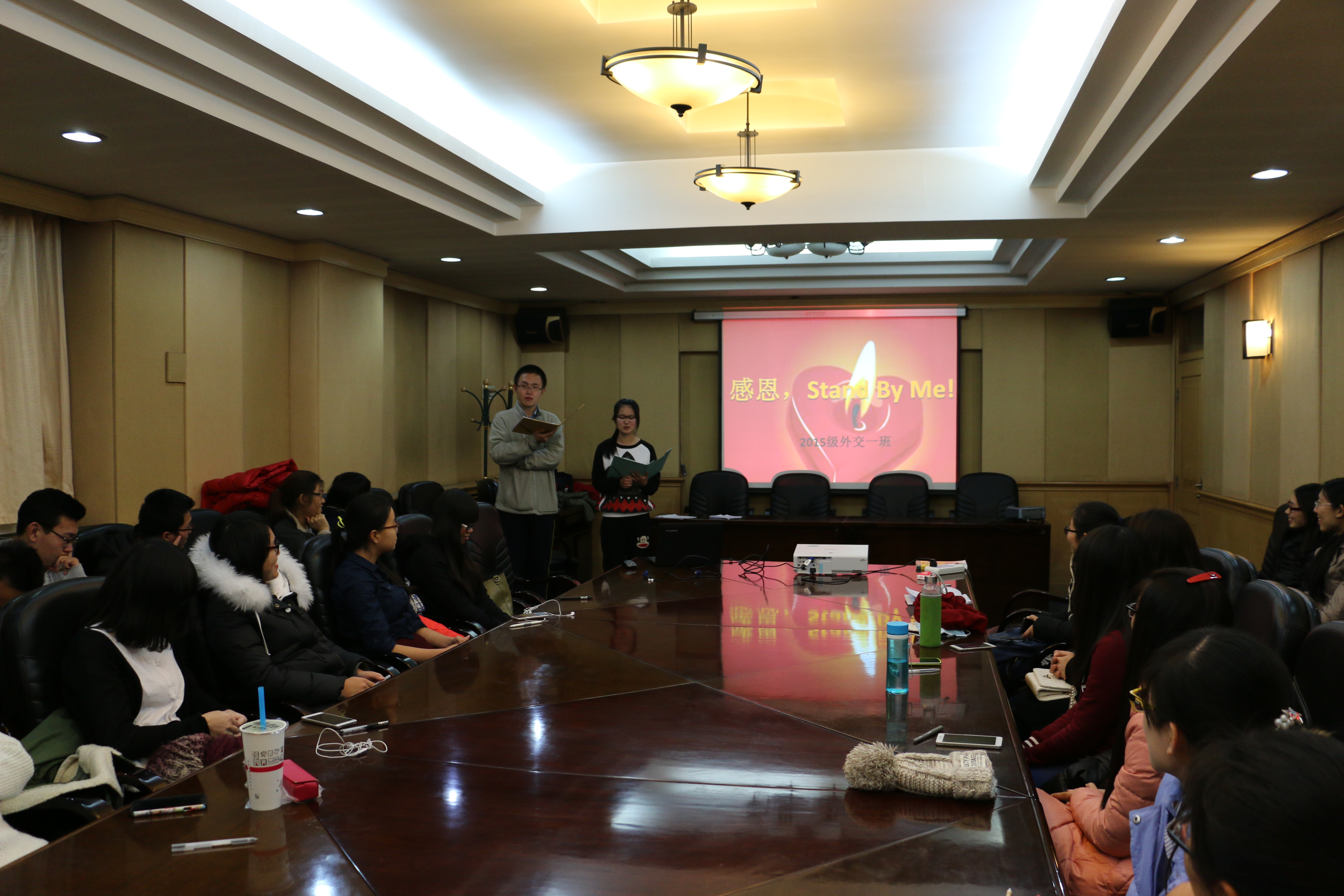 外交学2015级“感恩,伴我同行”主题班会在友谊会馆大会议室如期举行。本次活动呼应感恩节的节日氛围,旨在提升同学们对于中华优秀传统美德——感恩的认识与理解。并借此机会进一步加强师生间的沟通及班级内部的凝聚力。