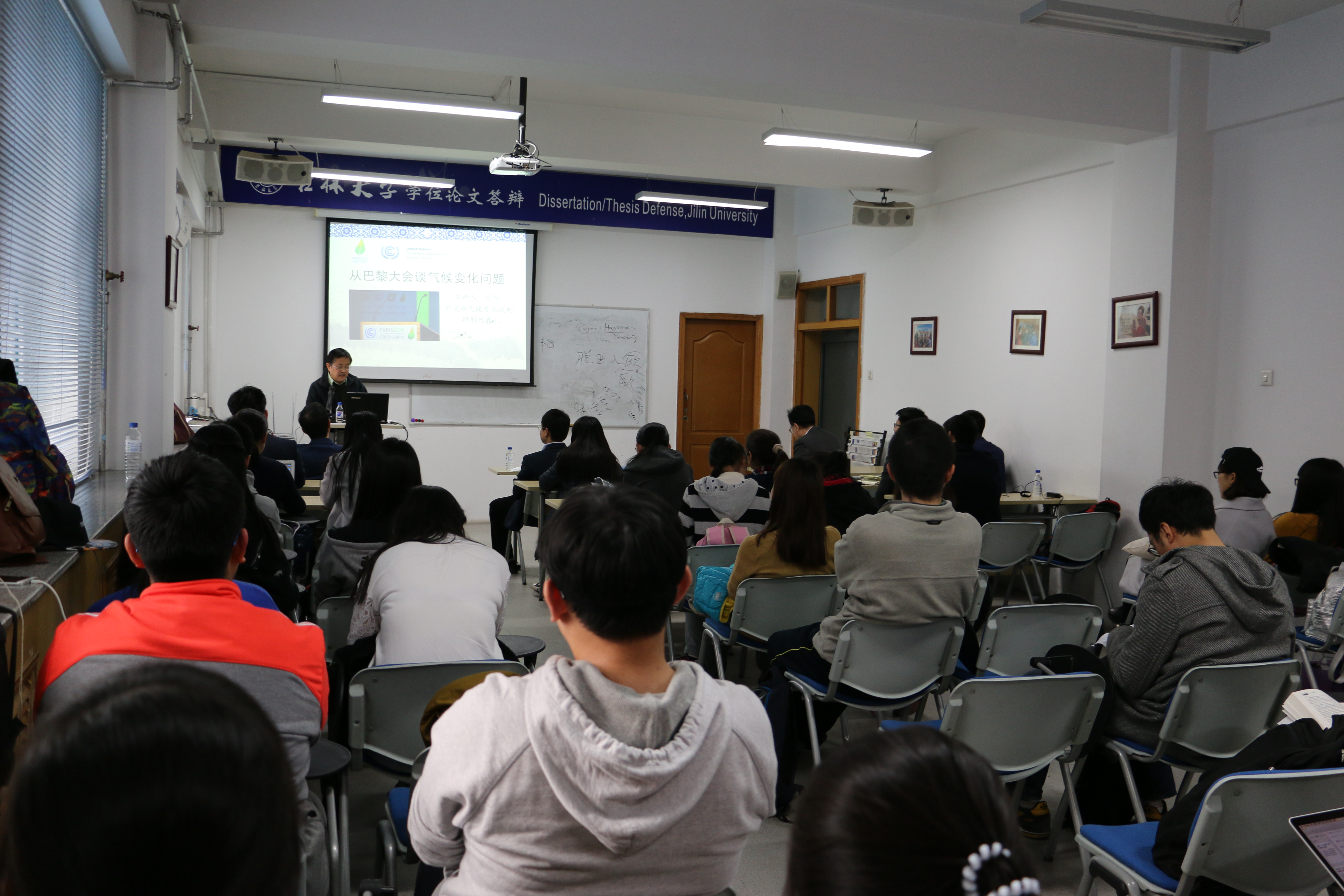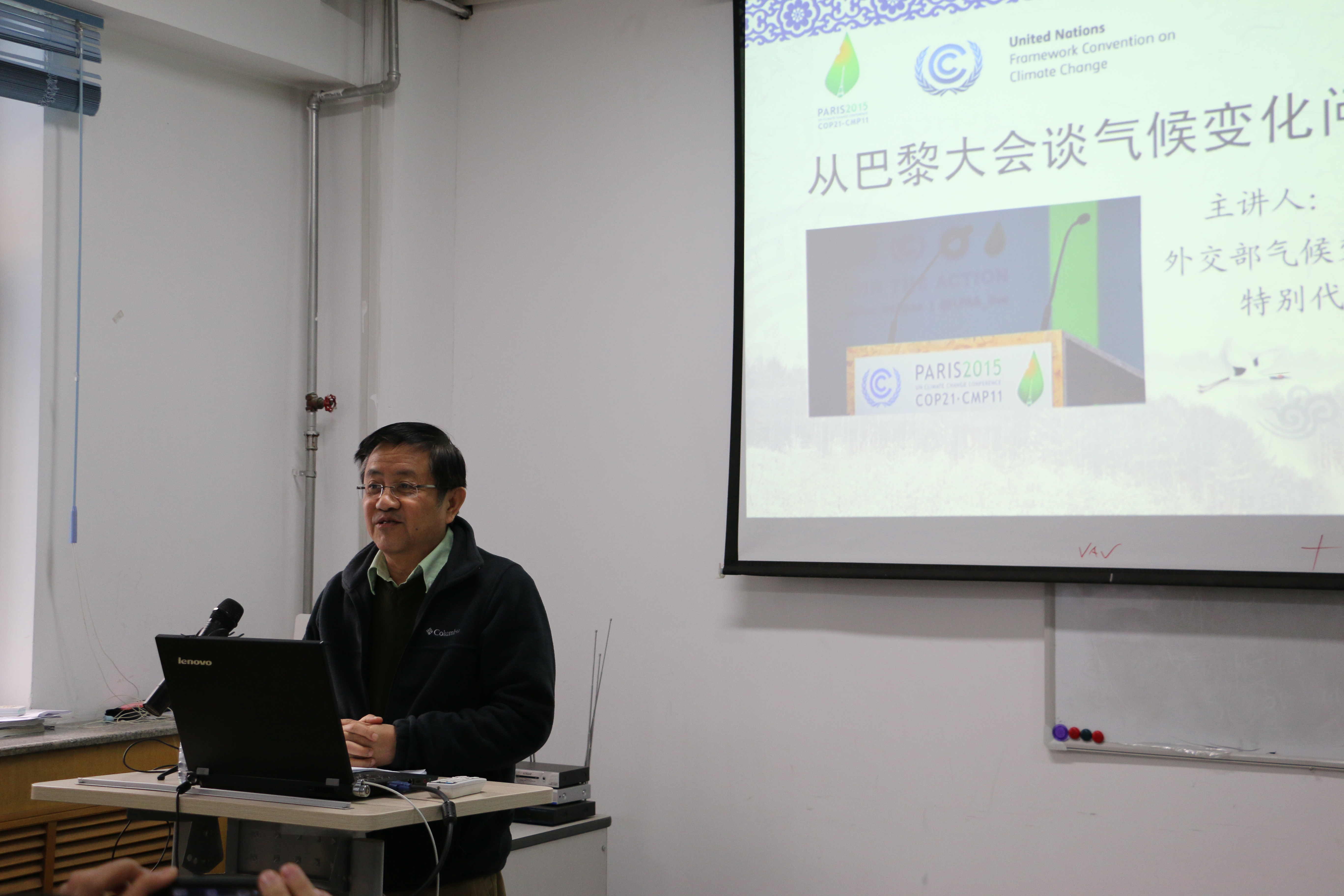 在讲座中,高风先生首先介绍了与气候变化问题相关的国际组织与相关条约,揭示了气候变化与多变外交之间的关系。后以巴黎大会为具体案例,展示了国际社会对气候问题的关注度。高先生指出,虽然《巴黎协定》不具有强制性,但其首推绿色发展,提倡绿色地毯成为国际潮流的理念,将对各国气候治理及发展产生深远的影响。最后,高先生点明国内气候问题所面临的严峻形势,同时,他也向同学们介绍了国内下阶段应对气候变化的工作展望,并对展望计划进行点评。
