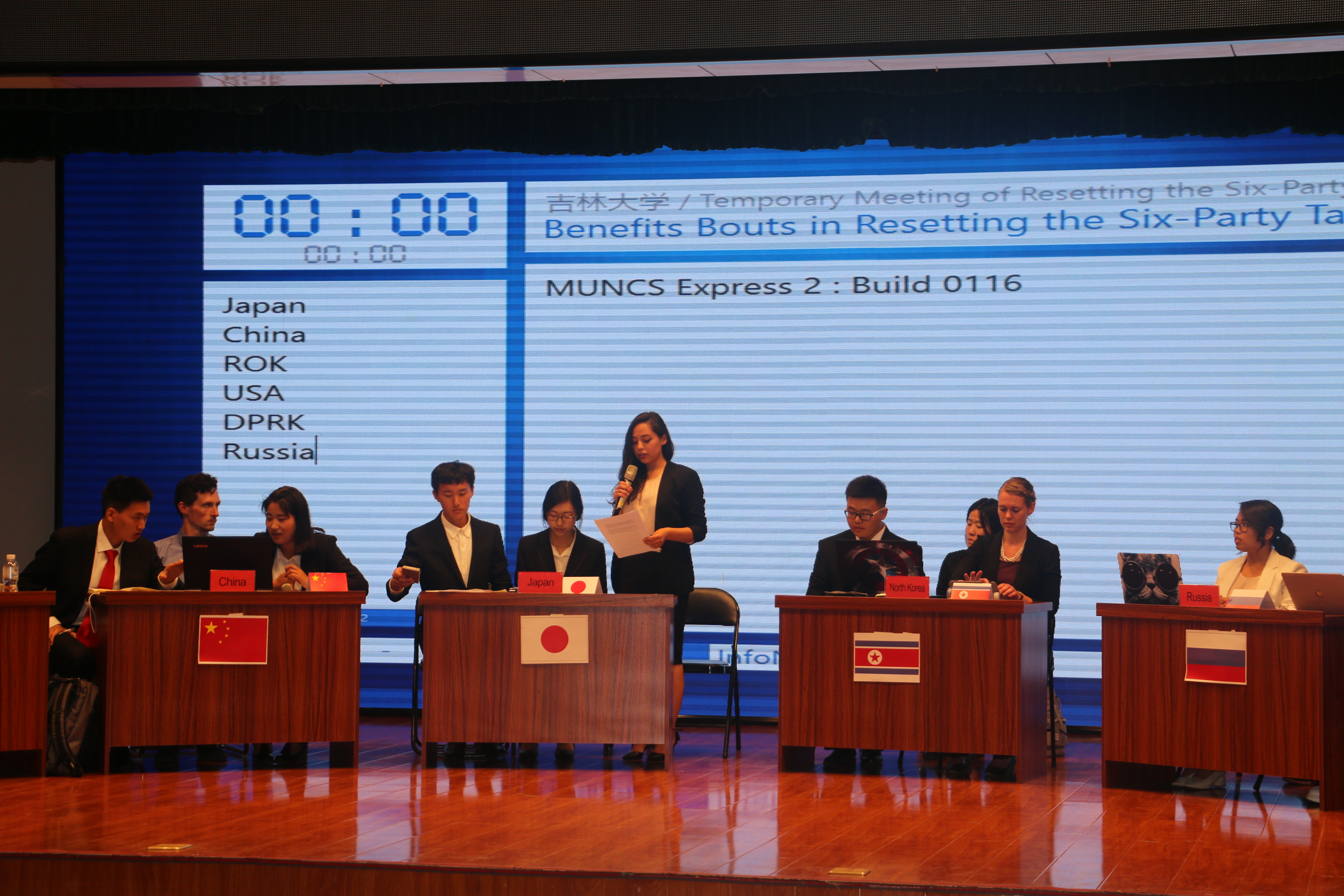 与会代表分别是由中国学生与加拿大访问学生共同组合的:美国代表、日本代表、俄罗斯代表、中国代表、韩国代表和朝鲜代表。本次谈判中,各位代表就自身利益出发点与相关关切发表了意见。其中,朝鲜、日本就“朝方释放人质同时日方减轻相应的经济制裁”达成一致;美国表示在停止核试验的基础上同意适当减少在亚洲地区的武装部署;韩国向朝鲜释放了愿意对话甚至合作的信号;中俄表示希望建立新的对话机制来和平解决半岛问题。