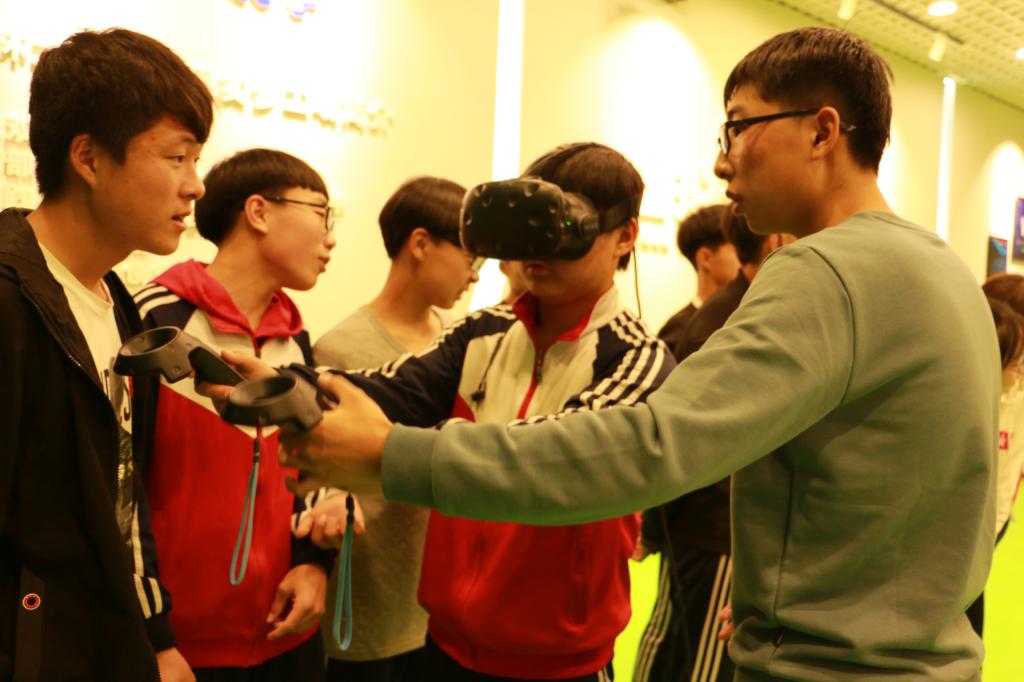 志愿者带着各自伙伴参观了吉大校园,在鼎新楼前合影留念。校园参观结束后,一行人来到位于李四光楼的“虚拟现实梦工厂”,计算机学院的王老师为同学们介绍了VR技术的原理以及现场设备的操作方式。在计算机学院教师和学生的指导下,同学们迫不及待地戴上VR眼镜,亲身体验了科技感满满的VR虚拟现实技术,现场气氛热烈,所有同学都踊跃参与。