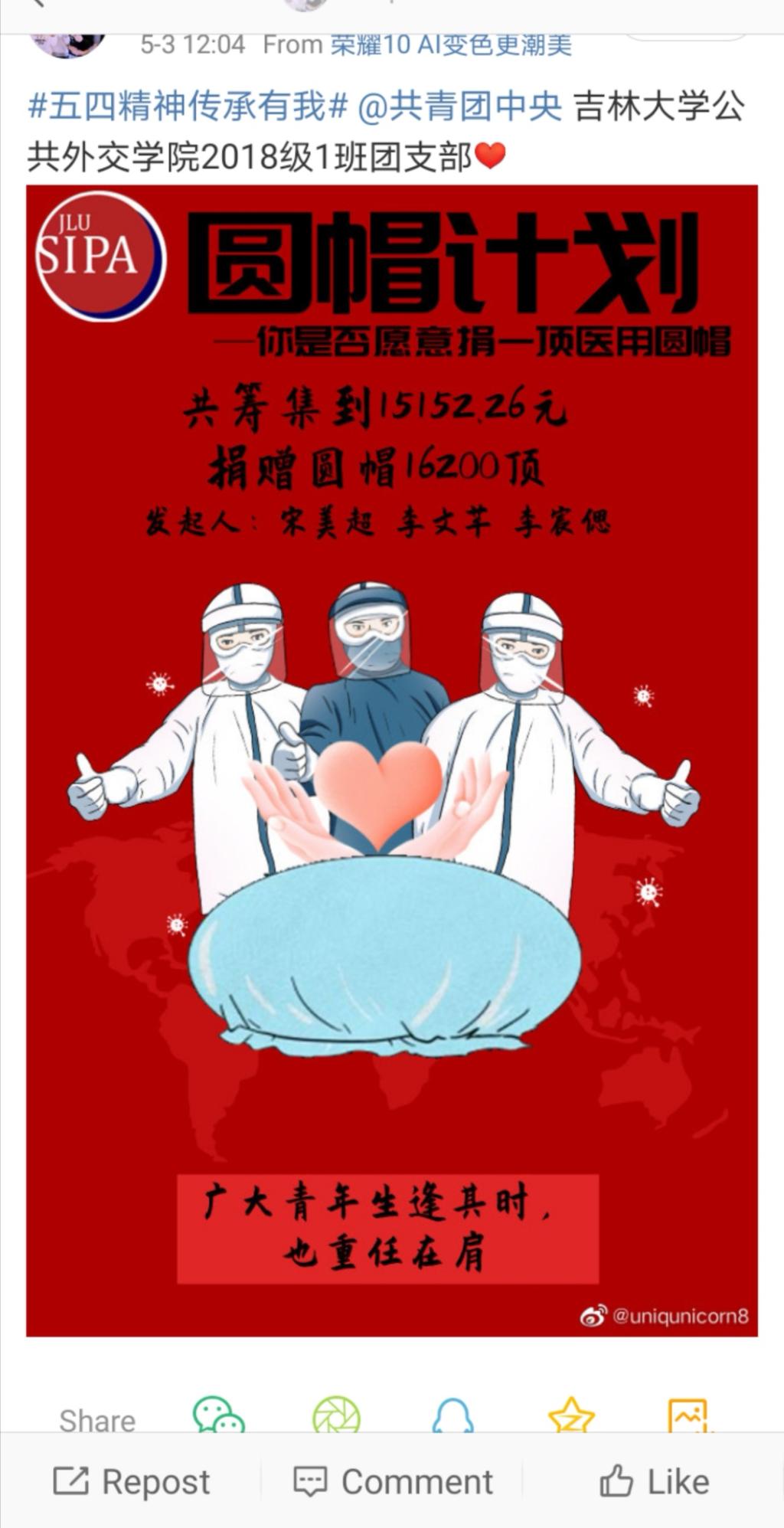 2020年初,众多一线医院与新型冠状病毒展开斗争,许多医护人员写下请战书,全国人民上下一心驰援武汉,各种募捐渠道都得到了广泛响应,真正让人体会到什么是“一方有难,八方支援”。然而,在紧张的抗疫之战中,湖北省一些医院物资不足,甚至出现五六位医护人员共用一套防护服的情况。在观察到这种状况之后,2018级1班团支部两位优秀青年宋美超和李文芊决定组织参与“医用圆帽捐赠计划”,自1月26日发起,结合当地疫情和医院需求,计划为湖北省黄冈市中心医院、孝感市第一人民医院、南漳县中医医院和咸宁市第一人民医院四家医院各捐赠5000个医用原帽。在社会各界的支持与努力下,此次计划最终为四家医院捐赠医用原帽共计16200顶。“圆帽计划”完美诠释了新时代青年生逢其时且重任在肩,在祖国最需要的时刻贡献青春力量的优良品质。我支部将此事件作为优秀的抗疫案例进行宣传,希望激励更多的青年踊跃投身于建设祖国的伟大工程之中,不畏艰险抗击疫情。