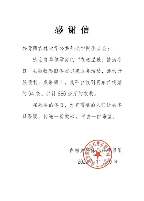 通过校团委侯博宇老师提供的讯息,我们将一部分冬衣点对点邮寄给了贵州省黔东南州黎平县双江镇黄岗村的村民;一部分通过“白鲸鱼”旧衣回收平台捐赠至山西省闻喜县神柏乡上丁村。截至目前,两地村民均已接收到广大师生们的“冬日温暖”。