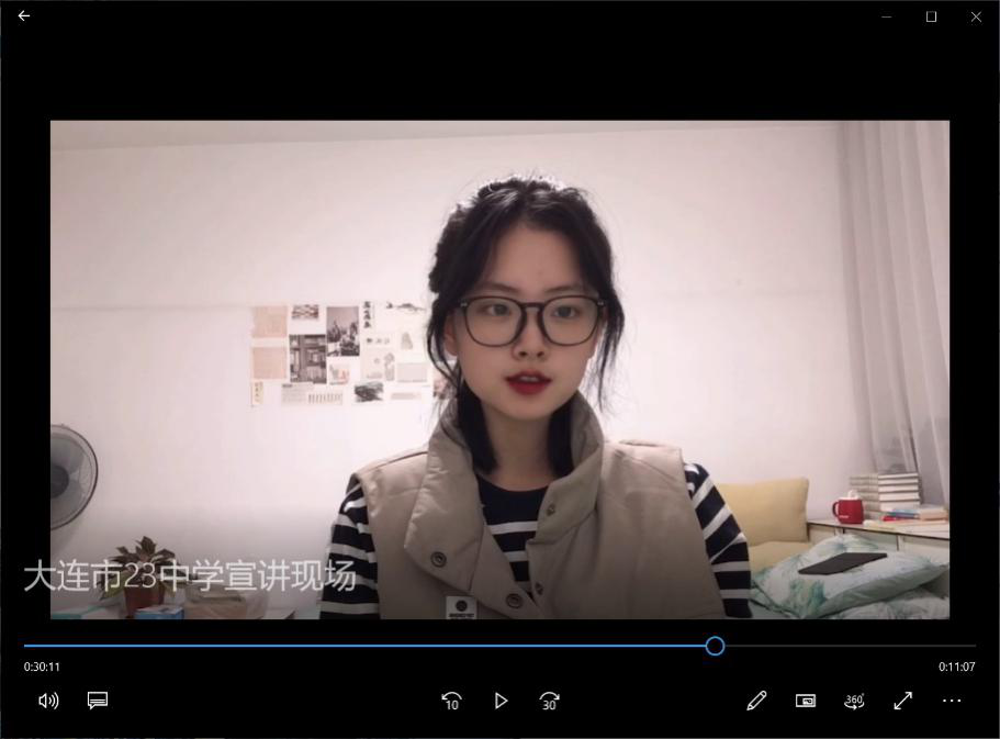 参加辽宁省大连市第二十三中学的宣讲同学出于对疫情防控的考虑,选取了一种新的招生宣讲方式,即通过制作视频短片的形式描绘吉大的师资力量、学院分布、学习生活和相关的学生组织概况等。
