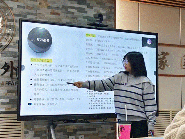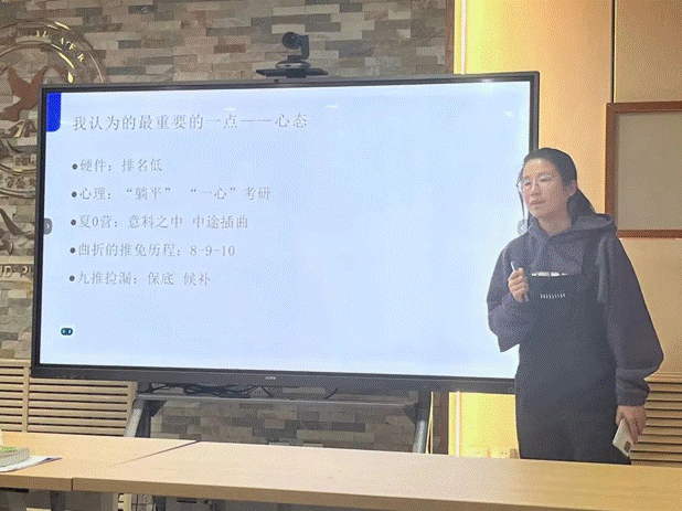 宣佳莹同学向大家分享了自己的保研体验和心得体会。她从“自身基本情况”、“材料准备”、“复习准备”与“面试经历和预推免名额”四个方面进行介绍。她强调,成绩排名与英语成绩尤为重要,鼓励大家以学习成绩为主要抓手,同时注重英语能力的提升。随后,她就自身复习材料准备与面试经历进行了分享,详细介绍了不同院校的面试特点。最后,她鼓励同学们勤练英语口语,锻炼应变能力,以良好心态迎接挑战。