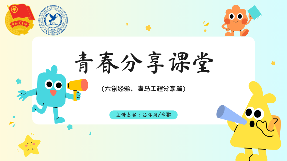 举办了本学期第二期“青春分享课堂”活动。活动由2023级本科生曲慧敏主持,邀请2021级本科生吕孝阳,2023级本科生郑翀分别与同学们分享关于“大创”、青马工程的经验。