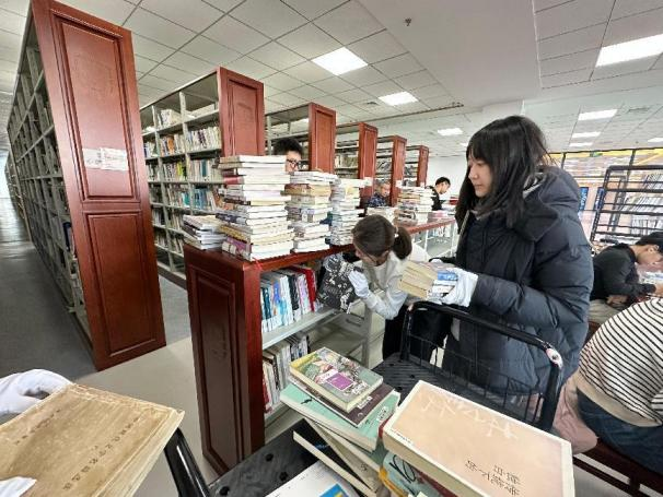 培训结束,志愿者们迅速进入工作状态,两两一组、默契配合,有序地从书架上取下图书,逐本核对索书号,按照书籍类别进行精准分类。